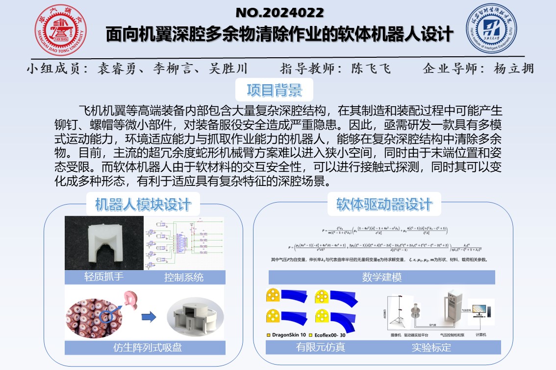 飛機(jī)機(jī)翼等高端裝備內(nèi)部包含大量復(fù)雜深腔結(jié)構(gòu),其制造和裝配過程中可能產(chǎn)生的鉚釘、螺帽等微小多余物將造成嚴(yán)重安全隱患。為此,亟待研發(fā)可用的深腔作業(yè)機(jī)器人,執(zhí)行多場(chǎng)景環(huán)境約束下的清除任務(wù)。新興的仿生軟體機(jī)器人以其交互安全性和運(yùn)動(dòng)靈活性,有望解決該挑戰(zhàn)。本項(xiàng)目圍繞軟體機(jī)器人的運(yùn)動(dòng)、抓取與控制,基于仿真和實(shí)驗(yàn),設(shè)計(jì)軟體驅(qū)動(dòng)器、軟體抓手與吸附單元,并開發(fā)氣動(dòng)控制系統(tǒng)進(jìn)行協(xié)同控制,最終完成軟體機(jī)器人的功能驗(yàn)證。