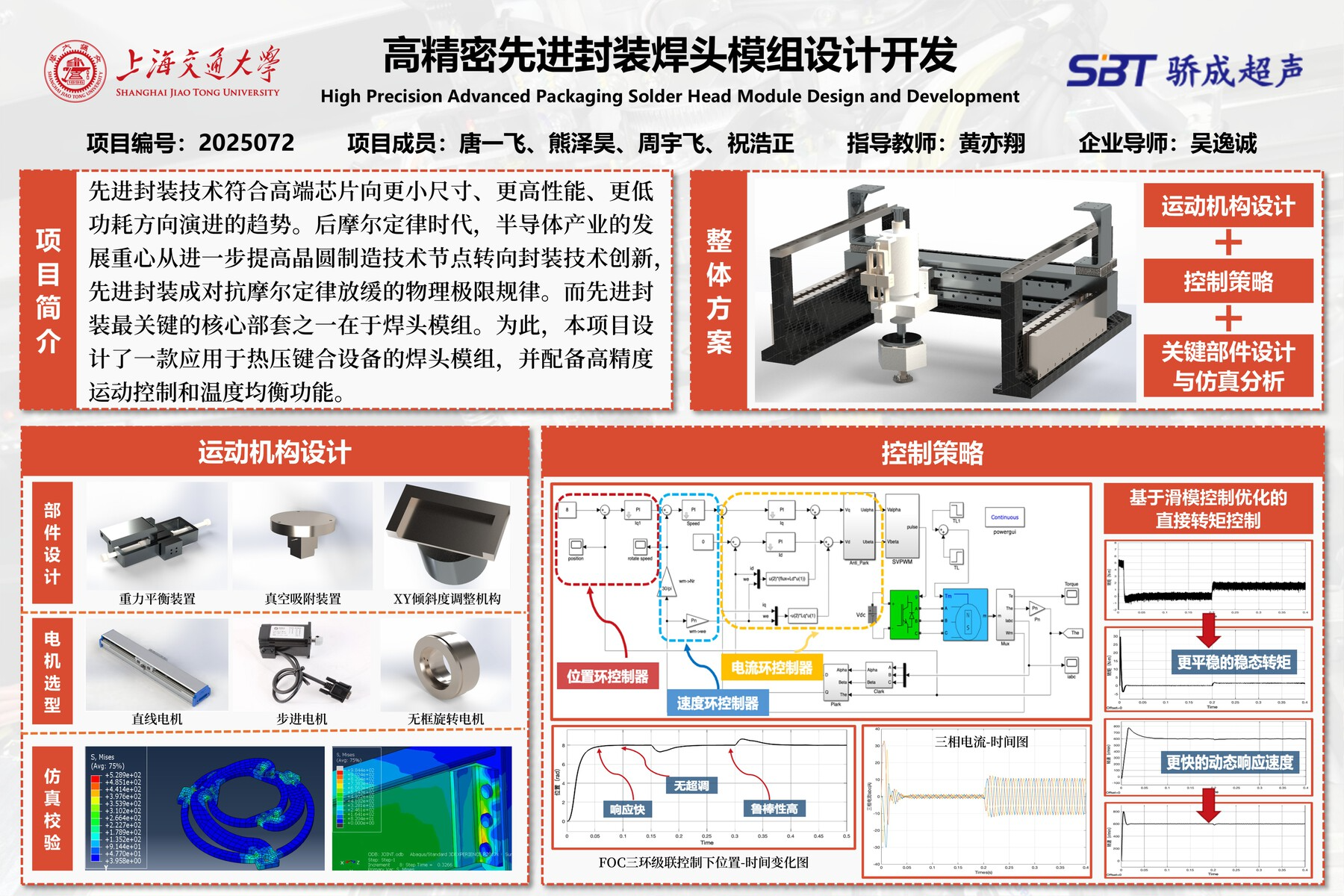 先進(jìn)封裝技術(shù)符合高端芯片向更小尺寸、更高性能、更低功耗方向演進(jìn)的趨勢。后摩爾定律時代,半導(dǎo)體產(chǎn)業(yè)的發(fā)展重心從進(jìn)一步提高晶圓制造技術(shù)節(jié)點(diǎn)轉(zhuǎn)向封裝技術(shù)創(chuàng)新,先進(jìn)封裝成對抗摩爾定律放緩的物理極限規(guī)律。而先進(jìn)封裝最關(guān)鍵的核心部套之一在于焊頭模組。為此,本項(xiàng)目設(shè)計了一款應(yīng)用于熱壓鍵合設(shè)備的焊頭模組,并配備高精度運(yùn)動控制和溫度均衡功能。