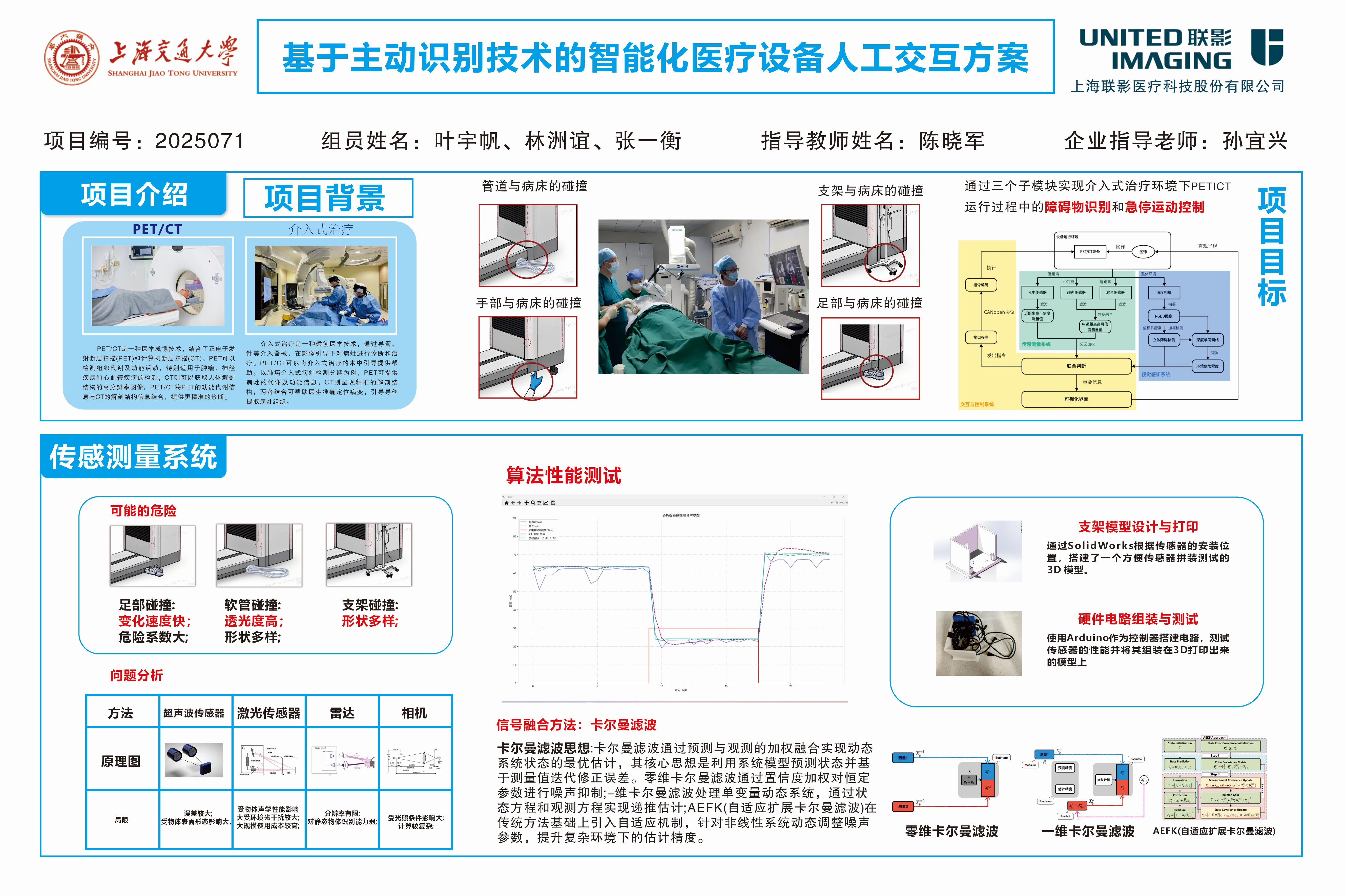 本畢業(yè)設計項目基于PET/CT設備在臨床介入操作中存在的典型安全問題——設備移動路徑與醫(yī)護人員或患者支撐結構之間可能產(chǎn)生碰撞風險。考慮到常規(guī)硬件系統(tǒng)在感知透明物、近距離物體等方面的局限,我們嘗試搭建一套多傳感器融合系統(tǒng),結合了光電、激光、超聲等不同類型傳感器,覆蓋大范圍的感知區(qū)間。此外,系統(tǒng)還引入了雙目深度相機,并圍繞RGB-D數(shù)據(jù)設計了前景分割和遮擋剔除算法,主要解決支撐結構等非危險目標的誤識別問題。在控制層,通過CANopen協(xié)議完成與底層伺服的通訊控制,結合人機界面,形成完整的感知—決策—執(zhí)行閉環(huán)。整個系統(tǒng)在聯(lián)影的實際測試平臺上完成驗證,系統(tǒng)性能穩(wěn)定,滿足對識別率、避撞率等多個關鍵指標的要求。