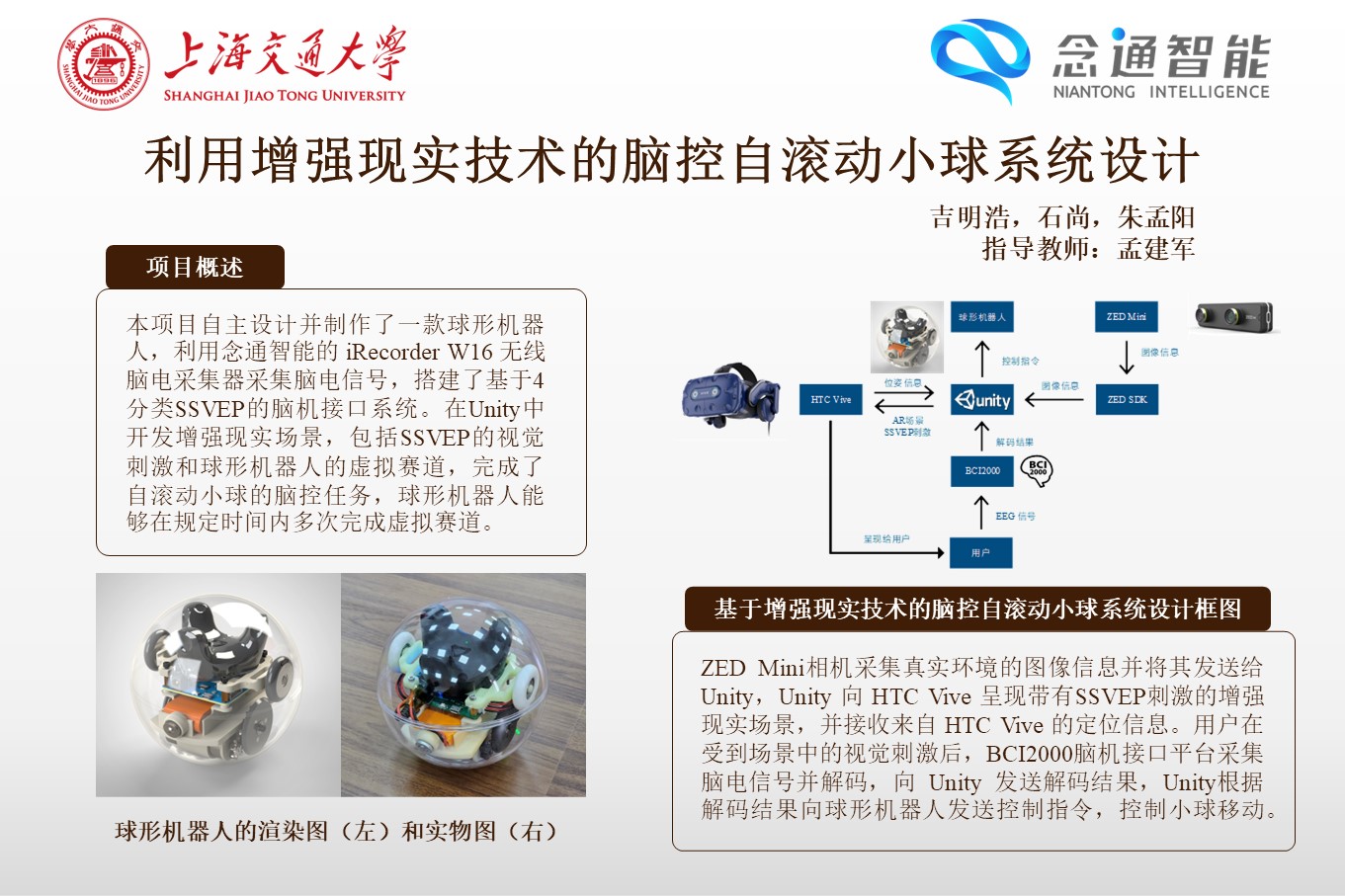 本項(xiàng)目面向腦控自滾動(dòng)球形機(jī)器人交互場(chǎng)景,設(shè)計(jì)制作一款球形機(jī)器人,在SJT腦機(jī)接口系統(tǒng)的基礎(chǔ)上,利用念通智能的 iRecorder W16 無(wú)線腦電采集器,使用BCI2000腦機(jī)接口系統(tǒng)平臺(tái),設(shè)計(jì)、開(kāi)發(fā)并搭建基于增強(qiáng)現(xiàn)實(shí)的腦控界面,裁剪相應(yīng)的穩(wěn)態(tài)視覺(jué)誘發(fā)電位SSVEP并解碼得到結(jié)果,同時(shí)運(yùn)用Unity建立增強(qiáng)現(xiàn)實(shí)場(chǎng)景,實(shí)現(xiàn)視覺(jué)刺激和虛擬賽道,完成自滾動(dòng)小球的腦控任務(wù),在規(guī)定時(shí)間內(nèi)完成規(guī)定的賽道軌跡。