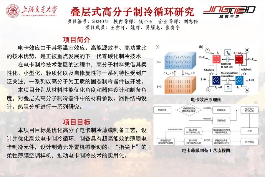本項目目標是設(shè)計與制造全新一代全固態(tài)、疊層式、高能效、零碳排放的電卡制冷系統(tǒng)樣機。基于巨電卡效應(yīng)的物理原理,設(shè)計并制備具有高電-熱轉(zhuǎn)換效率的高分子電卡制冷復(fù)合材料,探究復(fù)合材料中亞納米-納米-微米跨尺度結(jié)構(gòu)-效應(yīng)關(guān)系,優(yōu)化高分子電卡制冷薄膜制備工藝,設(shè)計并優(yōu)化高效電卡制冷循環(huán),制備具有超高能效的薄膜電卡制冷元件,設(shè)計制造無外置機械驅(qū)動的、超高功重比的、“指尖上”的柔性薄膜空調(diào)樣機,推動電卡制冷技術(shù)的實用化。