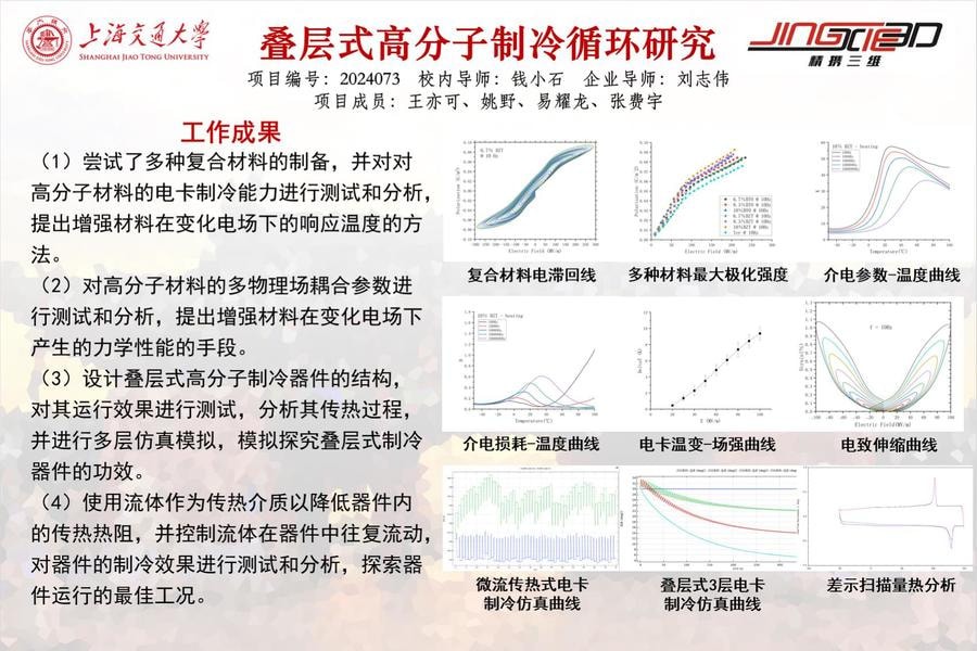 (1)嘗試了多種復(fù)合材料的制備,并對對高分子材料的電卡制冷能力進行測試和分析,提出增強材料在變化電場下的響應(yīng)溫度的方法。