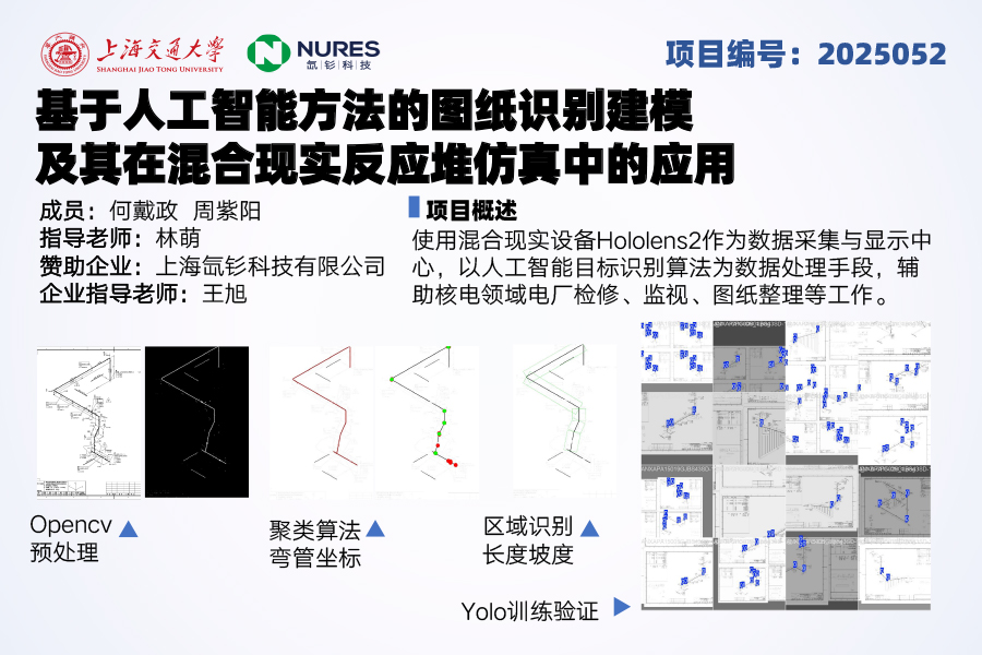 本項(xiàng)目以核能行業(yè)數(shù)字化轉(zhuǎn)型為背景,聚焦核電站圖紙識(shí)別效率低、建模流程復(fù)雜等痛點(diǎn),提出“基于人工智能方法的圖紙識(shí)別建模及其在混合現(xiàn)實(shí)(MR)反應(yīng)堆仿真中的應(yīng)用”。項(xiàng)目由上海交通大學(xué)機(jī)械與動(dòng)力工程學(xué)院與上海氙釤科技有限公司合作開展,旨在通過深度學(xué)習(xí)技術(shù)(如YOLO算法)實(shí)現(xiàn)核電站圖紙的自動(dòng)化識(shí)別與建模,并結(jié)合MR技術(shù)構(gòu)建虛實(shí)交互的仿真平臺(tái)。具體內(nèi)容包含兩部分:一是開發(fā)圖紙智能解析系統(tǒng),自動(dòng)提取管道布局、設(shè)備參數(shù)等關(guān)鍵信息并生成三維模型;二是基于HoloLens2設(shè)備實(shí)現(xiàn)多機(jī)協(xié)同、實(shí)時(shí)數(shù)據(jù)交互的MR仿真應(yīng)用,支持核電站設(shè)計(jì)、檢修等場(chǎng)景的虛擬操作。項(xiàng)目通過技術(shù)創(chuàng)新推動(dòng)核能行業(yè)智能化升級(jí),助力“雙碳”目標(biāo)實(shí)現(xiàn),兼具工業(yè)應(yīng)用價(jià)值和市場(chǎng)潛力。