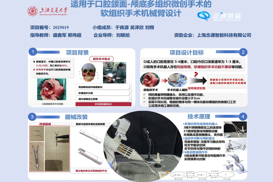 具有高風(fēng)險(xiǎn)的口腔顱頜面腫瘤切除手術(shù),由于局部解剖結(jié)構(gòu)精細(xì)復(fù)雜、軟硬組織交錯(cuò),一直是口腔顱頜面外科領(lǐng)域的治療難點(diǎn)。傳統(tǒng)術(shù)式多采用經(jīng)面部外切口,易造成大范圍手術(shù)創(chuàng)傷。基于此,經(jīng)口腔自然腔隙或口內(nèi)小切口入路的精準(zhǔn)手術(shù)非常必要。進(jìn)行此類手術(shù)需要手術(shù)機(jī)器人,現(xiàn)有手術(shù)機(jī)器人存在著智能化程度不足、功能單一、構(gòu)型有限的局限。本項(xiàng)目基于此設(shè)計(jì)一款適用于口腔頜面-顱底軟組織手術(shù)的人機(jī)協(xié)作機(jī)械臂,通過進(jìn)行軟組織手術(shù)機(jī)械臂的結(jié)構(gòu)設(shè)計(jì)與優(yōu)化、控制手柄的開發(fā)、運(yùn)動(dòng)學(xué)模型的建立與求解來實(shí)現(xiàn)上述功能。