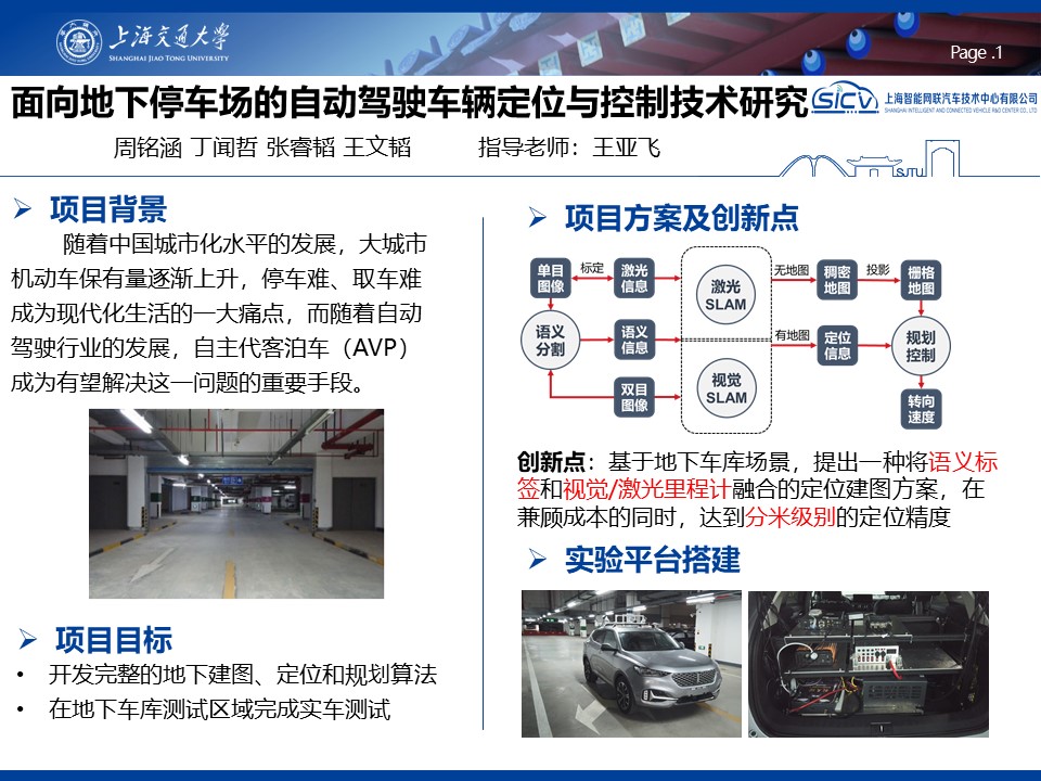 停車難、停車不規(guī)范并且易剮蹭都是泊車過程帶來不便。地下停車場具有無衛(wèi)星信號、場景簡單、特征重復(fù)的特點(diǎn),因此自動泊車的關(guān)鍵在于更精確的建圖與定位。小組成員一方面用兩種SLAM方法對場景進(jìn)行建圖與定位,另一方面引入語義分割提取出場景中每個(gè)物體的語義標(biāo)簽,在SLAM建圖過程中進(jìn)行優(yōu)化并剔除動態(tài)物體,從而提高建圖與定位精度。