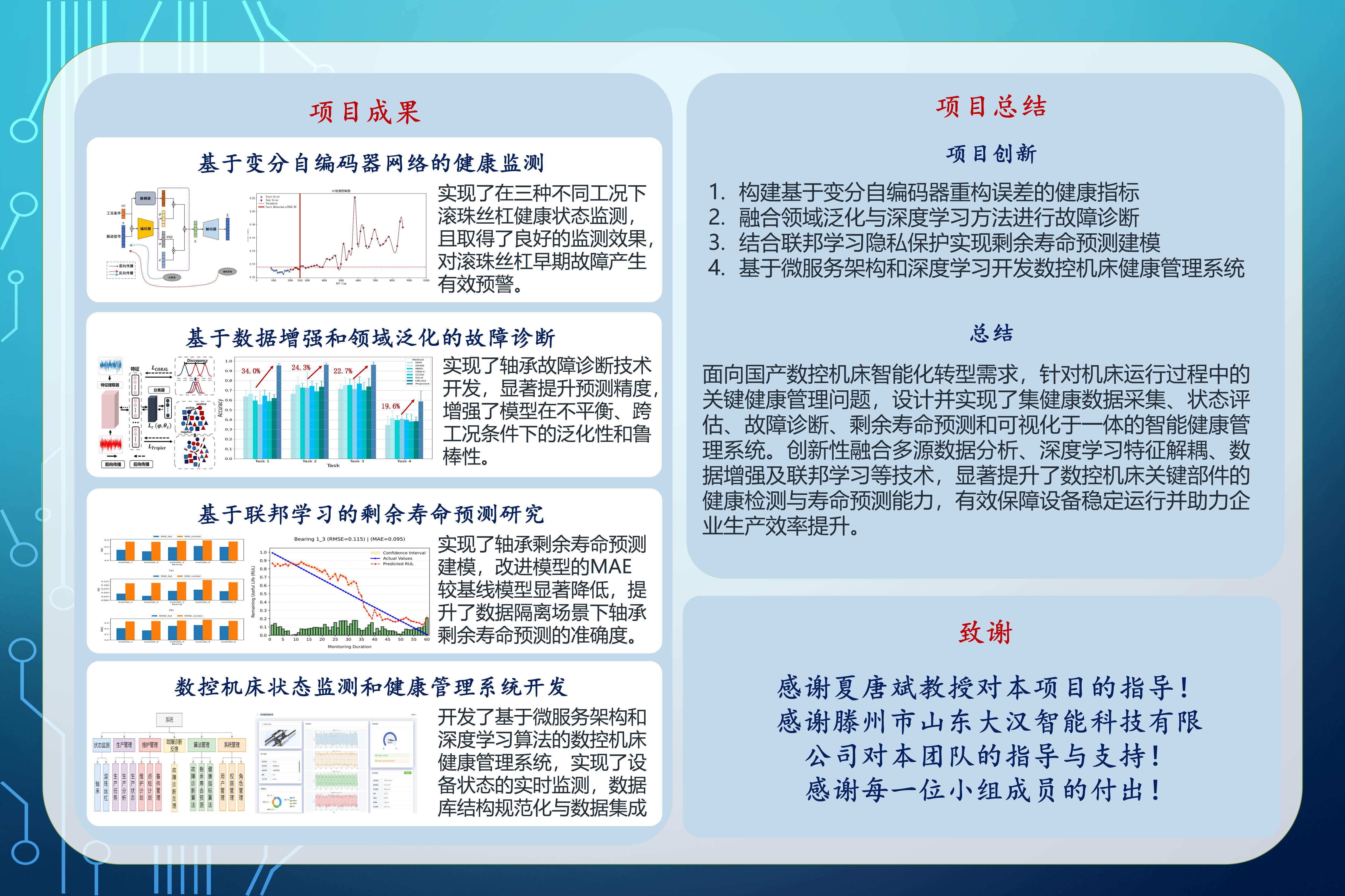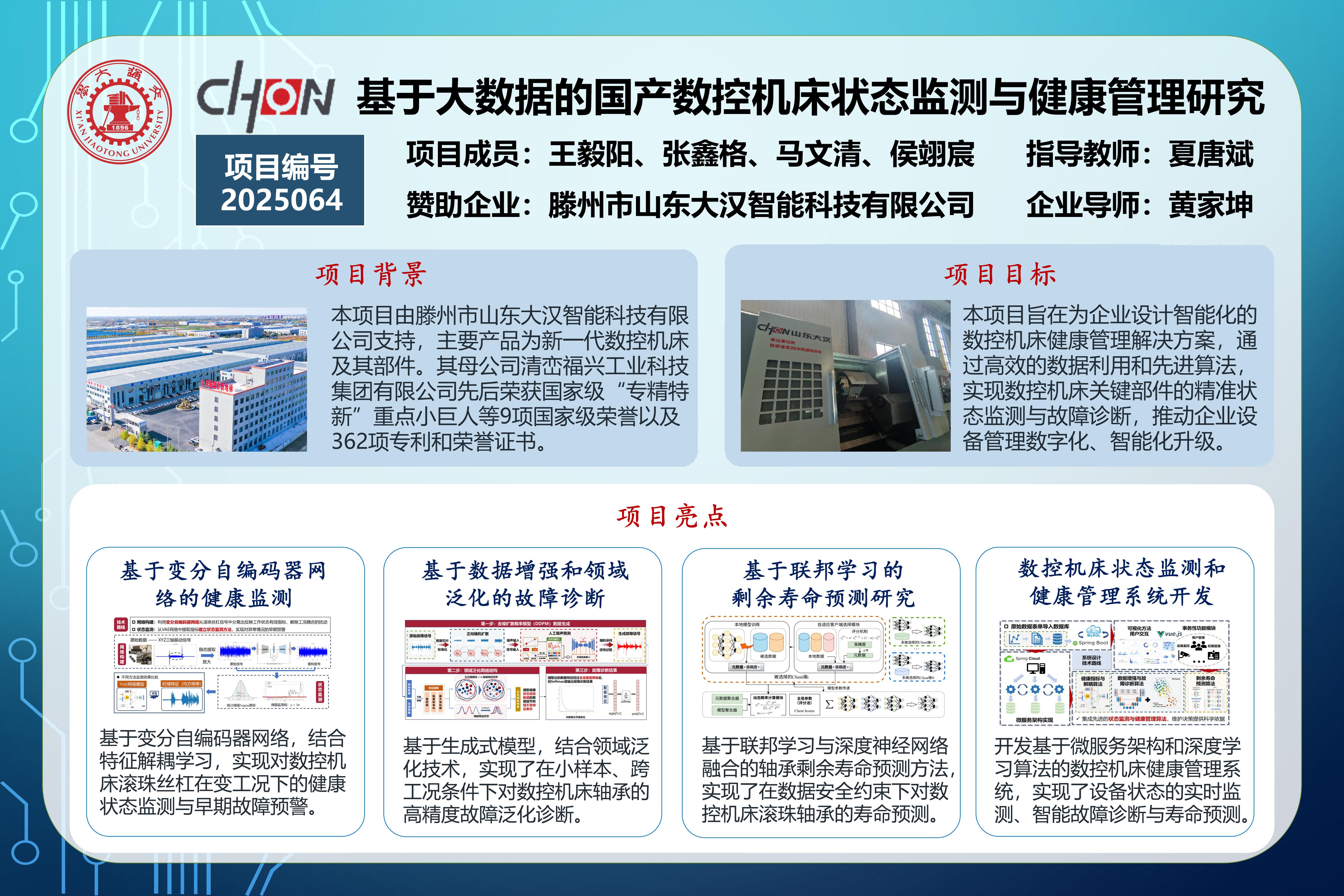 本項(xiàng)目受滕州市山東大漢智能科技有限公司贊助支持,其主要產(chǎn)品為新一代數(shù)控機(jī)床及其部件,致力于將信息技術(shù)與制造業(yè)深度融合。由于數(shù)控機(jī)床常在非平穩(wěn)、高負(fù)載的條件下運(yùn)行,其核心零部件易發(fā)生磨損老化,影響加工精度與效率,造成嚴(yán)重的經(jīng)濟(jì)損失。因此,通過研究機(jī)床關(guān)鍵部件在變工況下的退化過程,建立合適的狀態(tài)監(jiān)測和故障診斷方法,構(gòu)建多層級協(xié)同學(xué)習(xí)框架實(shí)現(xiàn)高精度壽命預(yù)測,并開發(fā)規(guī)范且高效的健康管理系統(tǒng),全面整合數(shù)據(jù)管理、算法部署和可視化功能,對于保障數(shù)控機(jī)床的可靠性和安全性至關(guān)重要,可以有效輔助運(yùn)維管理決策,實(shí)現(xiàn)智能化升級賦能。