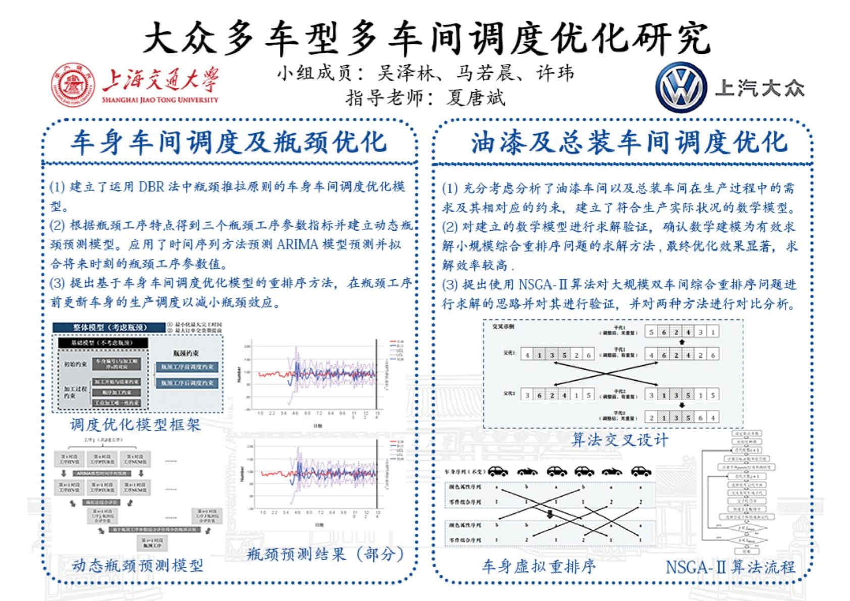 隨著經(jīng)濟(jì)全球化,汽車企業(yè)的競(jìng)爭(zhēng)日趨激烈,汽車制造車間必須能夠靈活滿足多樣性的訂單需求,實(shí)現(xiàn)以訂單為牽引的精益化、柔性化生產(chǎn)。本項(xiàng)目研究對(duì)象為上汽大眾安亭三廠的混合多車間加工產(chǎn)線,包括一個(gè)車身車間、一個(gè)油漆車間以及一個(gè)總裝車間。車間與車間之間串聯(lián)連接,不同車型在車間內(nèi)部的加工路線提前確定,是一個(gè)大規(guī)模多車型柔性生產(chǎn)線。其生產(chǎn)路徑復(fù)雜,限制條件多,對(duì)于精準(zhǔn)的生產(chǎn)安排及生產(chǎn)控制有著迫切需求。故確立項(xiàng)目主題為通過(guò)建立模型、算法求解和軟件仿真進(jìn)行生產(chǎn)調(diào)度研究,提高效率,優(yōu)化瓶頸;并搭建程序平臺(tái)實(shí)現(xiàn)排產(chǎn)計(jì)劃信息交互性的查詢與調(diào)整管理。