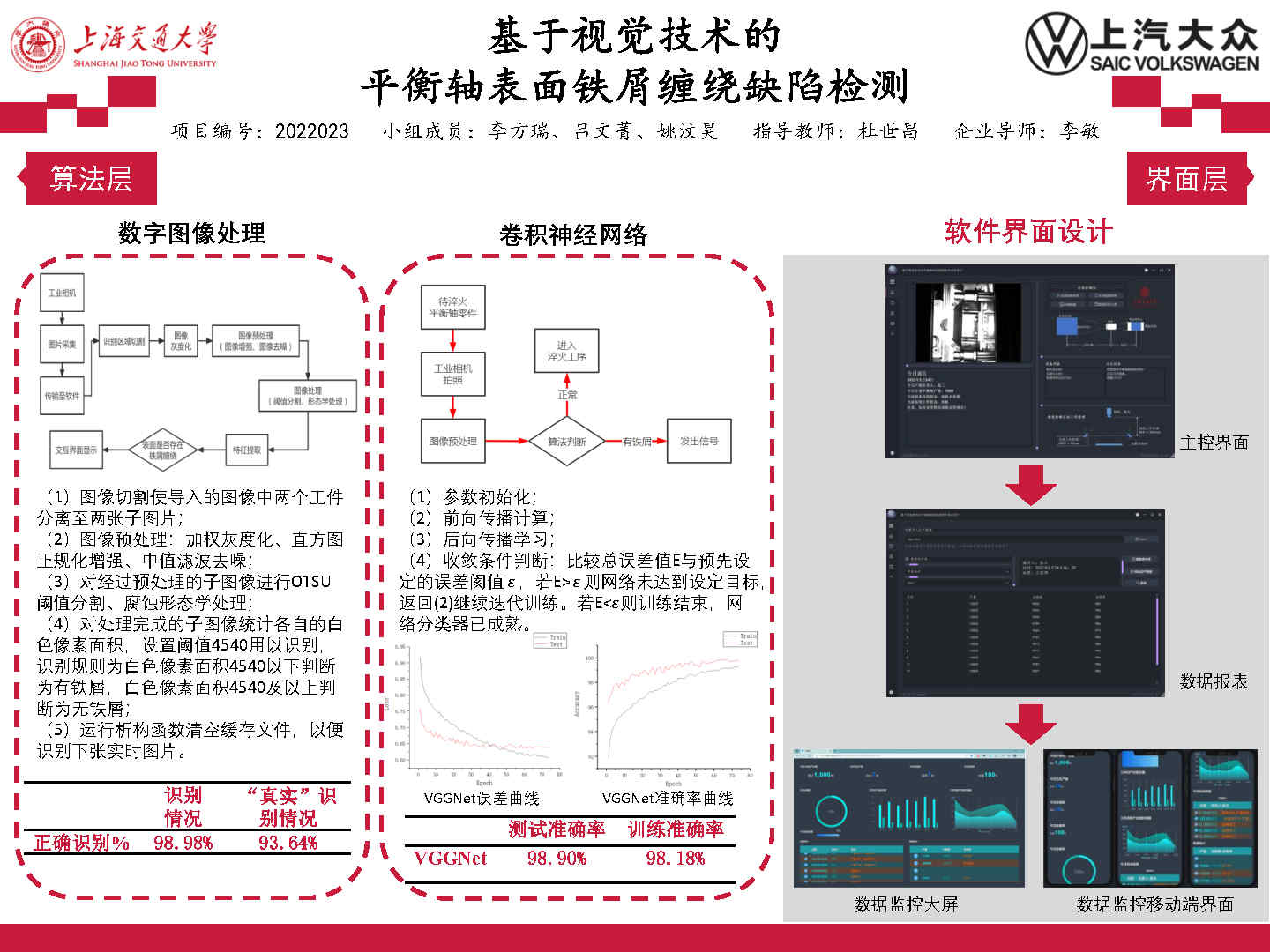 本項(xiàng)目針對企業(yè)自動(dòng)識別平衡軸表面鐵屑纏繞缺陷的實(shí)際需求,使用數(shù)字圖像和卷積神經(jīng)網(wǎng)絡(luò)兩種視覺技術(shù)進(jìn)行互補(bǔ),最大程度在實(shí)現(xiàn)檢測自動(dòng)化的同時(shí)保持高準(zhǔn)確率,同時(shí)設(shè)計(jì)了配套的軟件系統(tǒng)及用戶界面,最終較好地完成了企業(yè)方自動(dòng)識別有鐵屑纏繞平衡軸工件并提供可視化反饋的需求,避免了依賴操作人員進(jìn)行人工肉眼識別產(chǎn)線上平衡軸是否存在缺陷的成本高、效率低的情況,解決了工業(yè)生產(chǎn)中的實(shí)際問題。