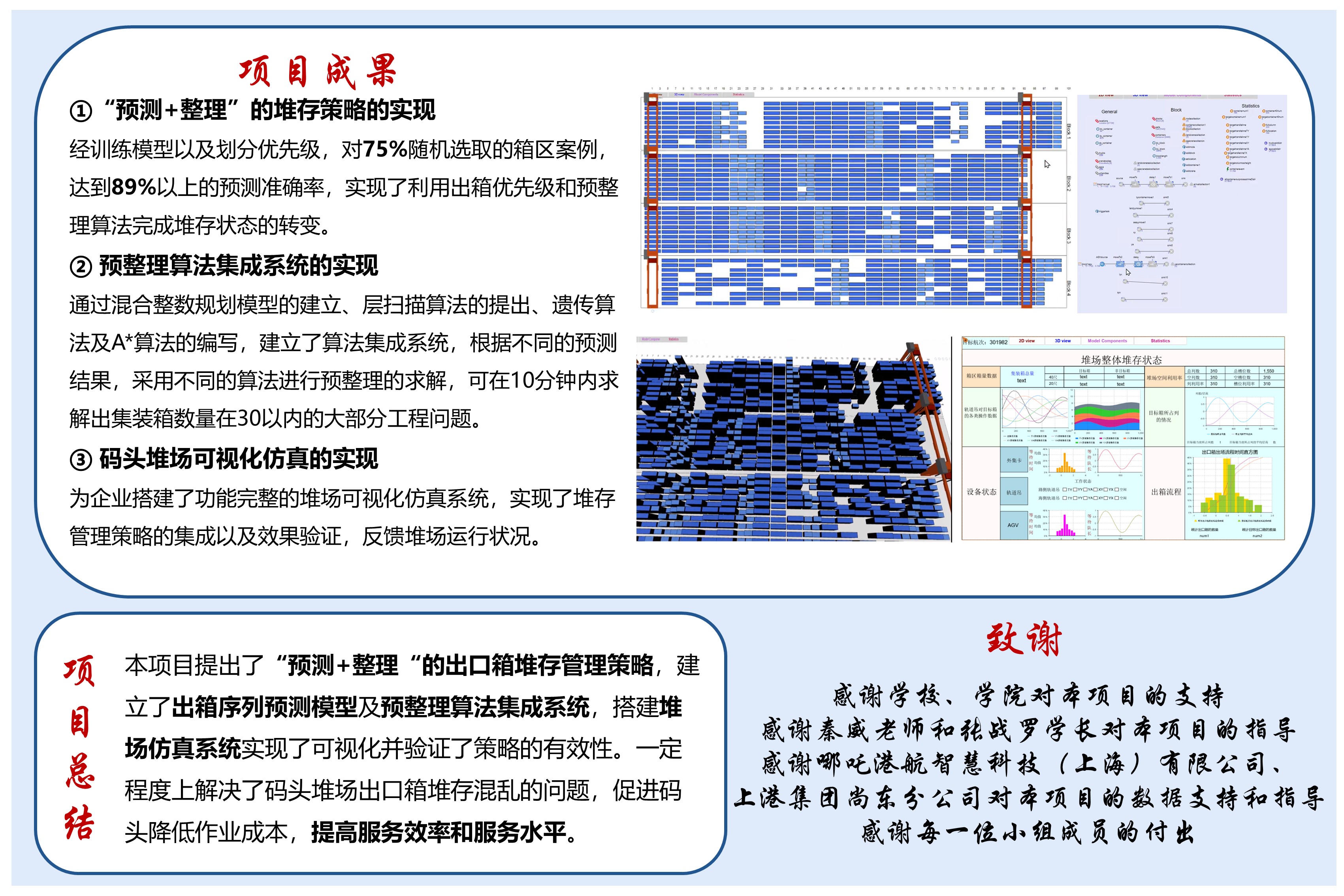本項(xiàng)目通過對(duì)洋山四期自動(dòng)化集裝箱碼頭數(shù)百萬條數(shù)據(jù)的分析,驗(yàn)證了堆場(chǎng)是碼頭的瓶頸環(huán)節(jié),并且驗(yàn)證了堆場(chǎng)翻箱和服務(wù)效率的相關(guān)性,從數(shù)據(jù)的角度,有力的論證了堆場(chǎng)是目前碼頭管理的重中之重。從數(shù)據(jù)中提取特征,對(duì)集裝箱出箱順序進(jìn)行有效的預(yù)測(cè),有著了極高的準(zhǔn)確率,根據(jù)此結(jié)果編寫了不同的算法,解決工程中不同規(guī)模、不同復(fù)雜度的集裝箱異地整理問題,可以在10分鐘內(nèi)解決出大部分集裝箱數(shù)量在30個(gè)以內(nèi)的整理問題。最后通過建立仿真模型,對(duì)本項(xiàng)目提出的方案進(jìn)行驗(yàn)證,得到了碼頭方工程師的高度認(rèn)可,并且依據(jù)此項(xiàng)目?jī)?nèi)容,撰寫了兩篇學(xué)術(shù)論文,項(xiàng)目研究兼具工程應(yīng)用性和學(xué)術(shù)研究性。