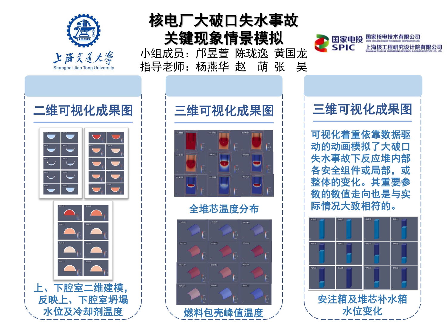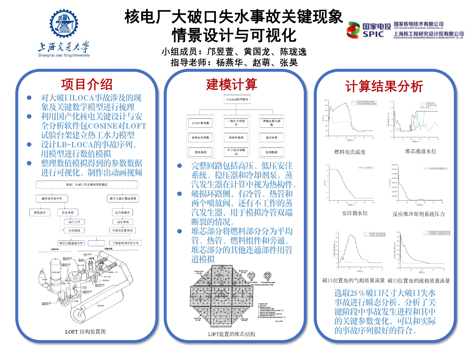 本項(xiàng)目的目標(biāo)是對(duì)大破口失水事故堆芯燃料棒-冷卻劑傳熱過程進(jìn)行可視化描述,并完成一部重點(diǎn)展現(xiàn)大破口失水事故過程的科普視頻。本項(xiàng)目基于國(guó)產(chǎn)核電站進(jìn)行分析,計(jì)劃利用安全分析軟件對(duì)冷卻劑通道建立模型,對(duì)冷卻劑的壓力、溫度、流量,以及燃料棒包殼溫度進(jìn)行數(shù)值模擬,得到適用于不同工況下的模型。作為科普視頻,具體呈現(xiàn)的幾個(gè)重要環(huán)節(jié)包括核電廠總體簡(jiǎn)介、一回路設(shè)備介紹、安全注入系統(tǒng)簡(jiǎn)介、壓力容器內(nèi)部堆芯結(jié)構(gòu)、發(fā)生的初因事件以及后續(xù)的事故序列、部分堆芯參數(shù)變化情況、壓力容器內(nèi)部環(huán)節(jié)以及最后對(duì)核電安全保護(hù)措施的說明。