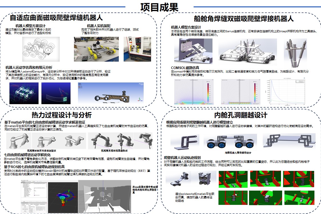 本項(xiàng)目旨在項(xiàng)目組中的每個(gè)成員根據(jù)不同的焊接場(chǎng)景分別設(shè)計(jì)針對(duì)弧形表面的單自由度焊縫跟蹤焊接機(jī)器人、針對(duì)直角焊縫的雙磁吸爬壁焊接機(jī)器人、針對(duì)過(guò)焊孔處焊接的仿人機(jī)械臂焊接機(jī)器人、針對(duì)底內(nèi)艙越障的鉆孔機(jī)器人,用以替代船舶內(nèi)艙惡劣環(huán)境下的人工作業(yè)。這些機(jī)器人相較于傳統(tǒng)人工作業(yè),既節(jié)省了人力成本,效率也顯著提升,工作過(guò)程的安全性也能得到保障,對(duì)維護(hù)船舶結(jié)構(gòu)的穩(wěn)定性具有重要作用。
