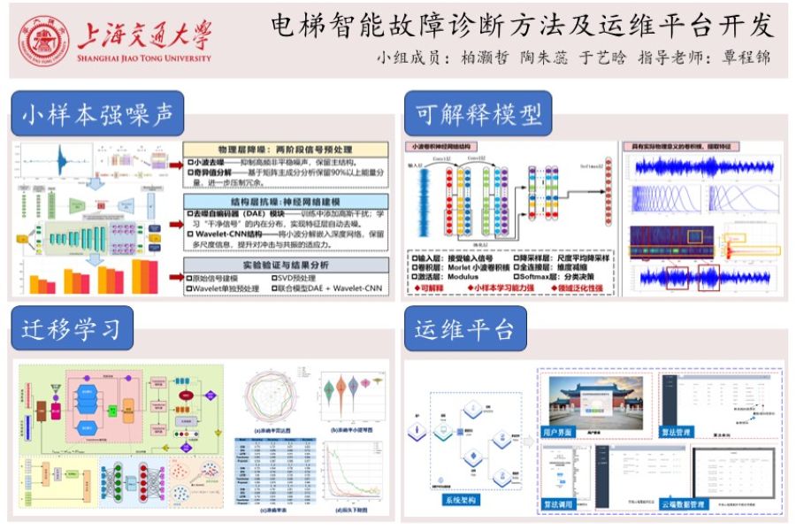 小樣本及強噪聲診斷方面,提出基于過采樣與遷移注意力機制的電梯小樣本故障診斷與基于信號去噪與自編碼融合結構的電梯強噪聲故障診斷;遷移學習方面,構建融合CNN-Transformer和MMD的跨工況電梯故障遷移診斷、融合MSCNN和混合注意力機制的跨噪聲電梯故障遷移診斷和基于CNN-LSTM和域對抗的跨設備電梯故障遷移診斷;可解釋性方面提出基于小波散射變換的電梯故障特征提取方法、基于小波散射變換的可解釋電梯故障診斷模型;運維平臺方面開發(fā)基于端邊協(xié)同的前后端分離電梯遠程智能運維云平臺和智能運維算法云端管理系統(tǒng)。