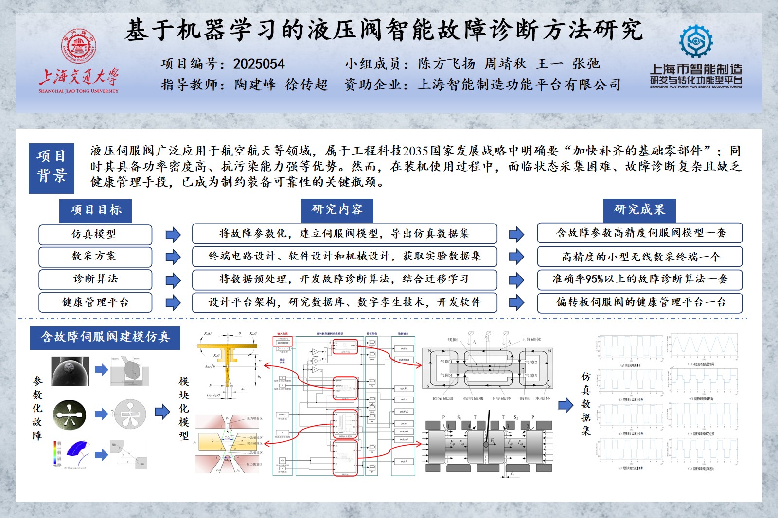 偏轉(zhuǎn)板伺服閥作為電液伺服系統(tǒng)的核心控制元件,其運行狀態(tài)直接關(guān)系到系統(tǒng)的性能和可靠性,高精度、智能化的故障診斷與健康管理至關(guān)重要。然而,傳統(tǒng)方法因依賴有限的可測信號和人為經(jīng)驗,難以實現(xiàn)對復(fù)雜工況下伺服閥的精準(zhǔn)監(jiān)測。因此,本項目開展了偏轉(zhuǎn)板伺服閥高精度建模、實驗數(shù)據(jù)采集、智能診斷算法開發(fā)及智能健康管理平臺的系統(tǒng)研究,旨在全面提升伺服閥的狀態(tài)感知、精準(zhǔn)診斷與智能管理能力,從而有效保障液壓系統(tǒng)的安全與可靠運行。