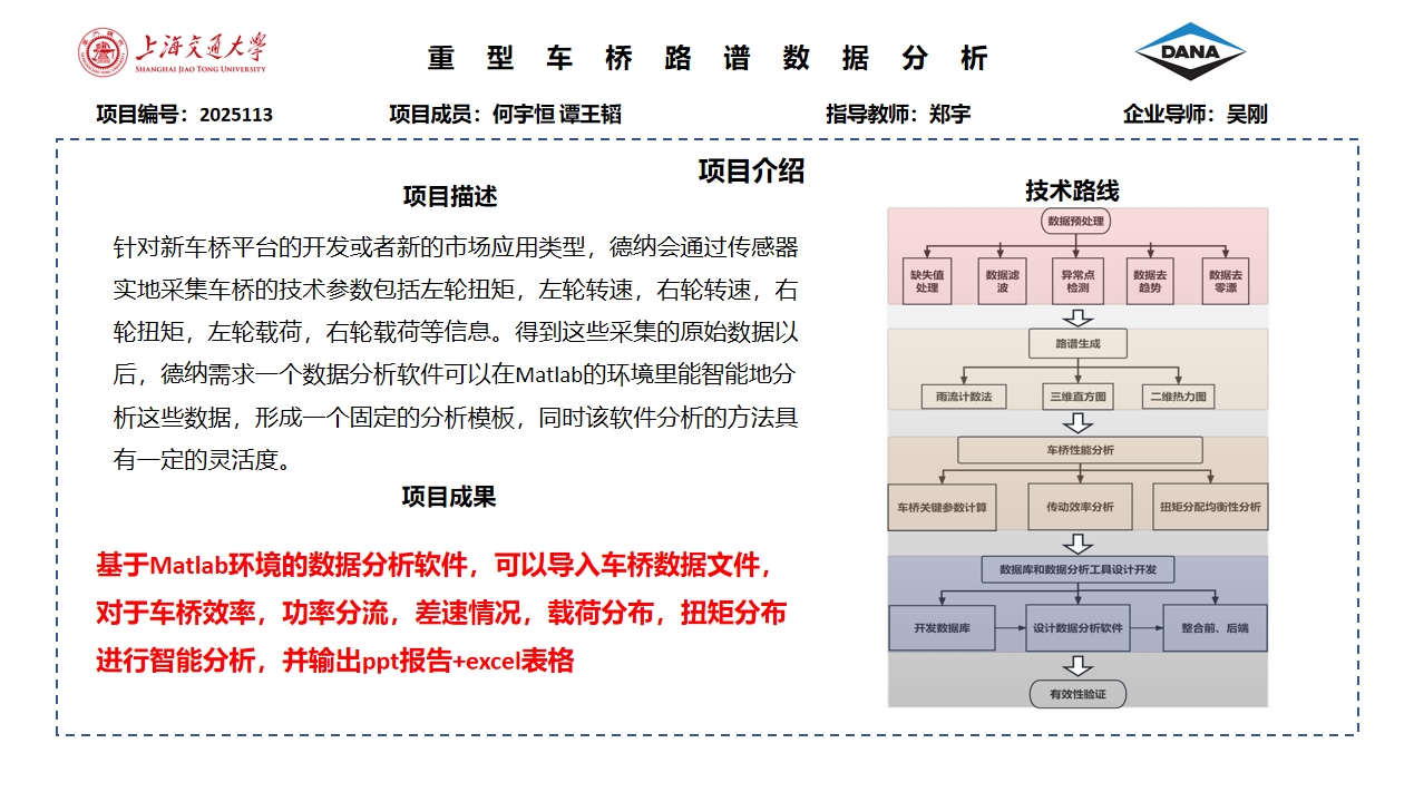 重型車橋路譜數(shù)據分析項目旨在開發(fā)一款基于Matlab的智能數(shù)據分析軟件,以高效處理和分析重型車橋在實際道路條件下的運行數(shù)據。車橋作為車輛的關鍵部件,其性能直接影響整車的承載能力和行駛安全。本項目通過采集車橋的載荷、扭矩、轉速等數(shù)據,運用先進的數(shù)據處理和分析技術,生成可視化路譜分析圖表,為車橋的性能評估和設計優(yōu)化提供科學依據。項目結合了數(shù)據預處理、特征提取、分布擬合等技術手段,旨在解決傳統(tǒng)方法在處理海量時序數(shù)據時的效率和準確性問題。