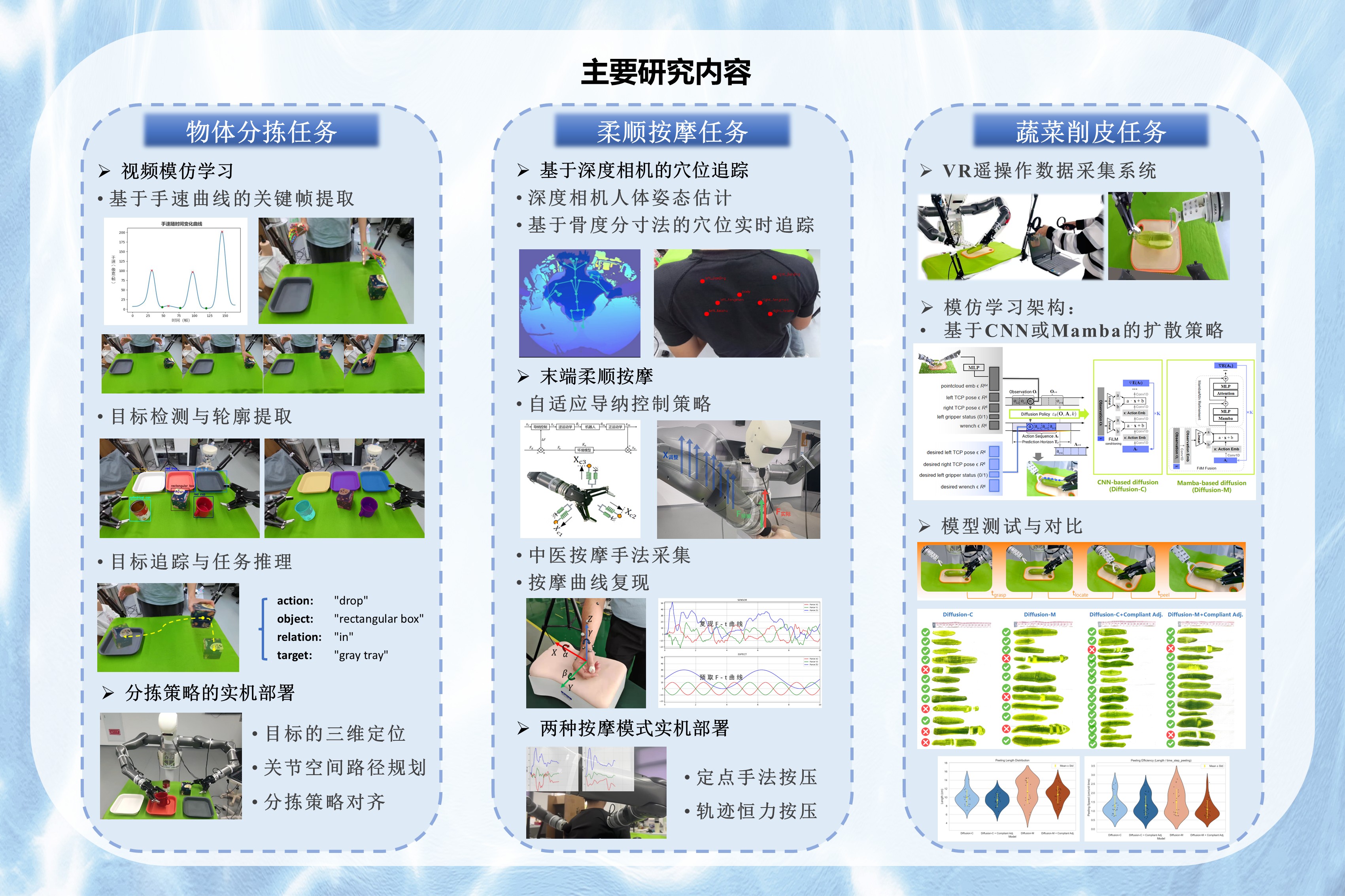 項目已完成仿人雙臂機器人平臺的軟硬件搭建與系統(tǒng)集成,具備視覺識別、語義感知、力控執(zhí)行等多模態(tài)能力,支持多類任務的靈活切換。在任務層面,成功實現(xiàn)了基于視頻模仿學習的物體分揀、基于力覺感知的柔順按摩,以及面向復雜接觸操作的蔬菜削皮三項典型任務。項目同時驗證了融合多模態(tài)感知與調節(jié)策略的控制方法,顯著提升了機器人對動態(tài)場景和任務變化的適應能力。相關成果為后續(xù)更完整的具身智能框架研究和思路探索奠定了堅實基礎。
