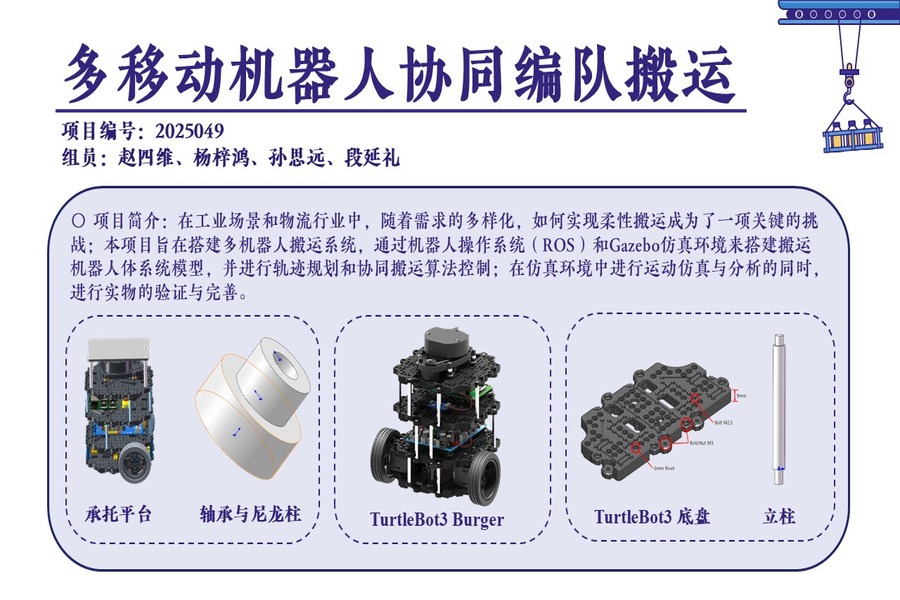 在現(xiàn)代工業(yè)場景中,多機(jī)器人協(xié)同搬運(yùn)系統(tǒng)展現(xiàn)出廣泛的應(yīng)用潛力。本項(xiàng)目基于校企合作背景,根據(jù)颯智公司提供的設(shè)想,結(jié)合仿真環(huán)境與實(shí)際場景實(shí)驗(yàn),設(shè)計(jì)搭建了一套高效、穩(wěn)定、可擴(kuò)展的多機(jī)器人協(xié)同搬運(yùn)系統(tǒng)。該系統(tǒng)采用TurtleBot3 Burger作為驅(qū)動機(jī)器人,裝載可旋轉(zhuǎn)式承托結(jié)構(gòu),配合環(huán)境感知與高精度建圖和定位算法、多機(jī)器人互定位算法、路徑規(guī)劃導(dǎo)航算法、協(xié)同編隊(duì)控制算法,能在搬運(yùn)過程中通過雙輪差速驅(qū)動實(shí)現(xiàn)整體的平動、旋轉(zhuǎn)、避障等功能。