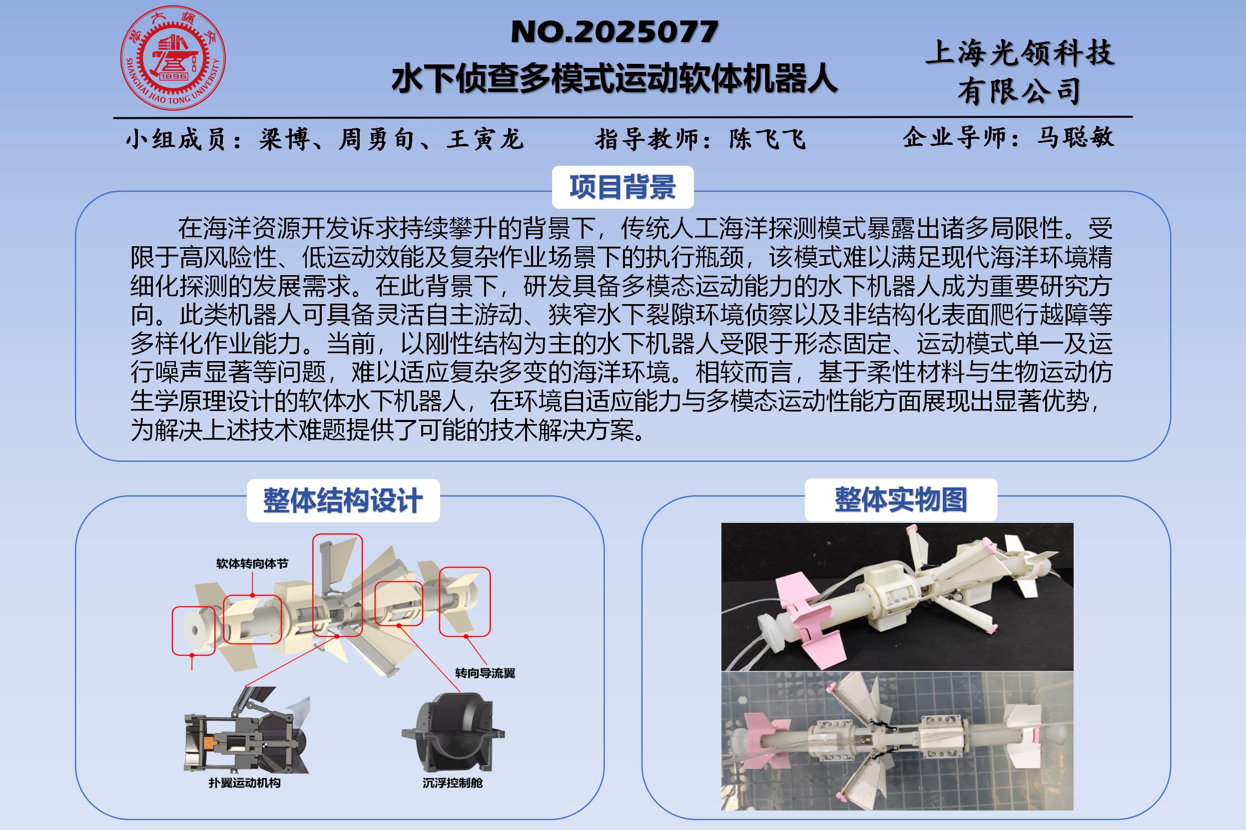 本項目針對海洋資源開發(fā)與生態(tài)保護領(lǐng)域?qū)Ω哌m應性水下探測裝備的迫切需求,聚焦傳統(tǒng)人工探測及剛性水下機器人在復雜海洋環(huán)境中面臨的技術(shù)瓶頸。針對傳統(tǒng)作業(yè)方式存在人員風險高、作業(yè)效率低,以及剛性機器人運動模式單一、環(huán)境適應性不足等核心問題,本研究創(chuàng)新性地提出一種具有多模態(tài)運動能力的仿生軟體水下機器人系統(tǒng)。通過融合柔性智能材料與仿生學原理,構(gòu)建可自主實現(xiàn)自由沉浮、三維巡游及表面越障的智能作業(yè)平臺,為深海科考、海底資源勘探及海洋生態(tài)監(jiān)測提供新的可能技術(shù)解決方案。