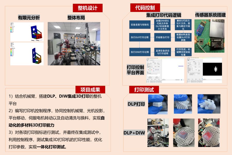 本項目旨在研發(fā)一種基于機械臂的光固化與直寫集成3D打印系統(tǒng),將數(shù)字光處理(DLP)技術和直接墨水書寫(DIW)技術與機械臂技術相結合,以實現(xiàn)更高精度、更復雜結構的多材料3D打印。項目背景源于傳統(tǒng)3D打印技術在材料選擇、打印精度、速度及多材料打印能力上的局限性,而航空航天、醫(yī)療器械等行業(yè)對復雜結構零部件的需求日益增長。項目包括硬件平臺設計、軟件與控制設計、多材料結構設計與集成3D打印測試。硬件設計涵蓋DLP和DIW技術的3D打印系統(tǒng)結構設計與部件加工;軟件與控制設計涉及打印參數(shù)規(guī)劃、路徑軌跡規(guī)劃及控制平臺開發(fā);多材料結構設計與測試關注參數(shù)化設計、打印參數(shù)優(yōu)化及性能測試。