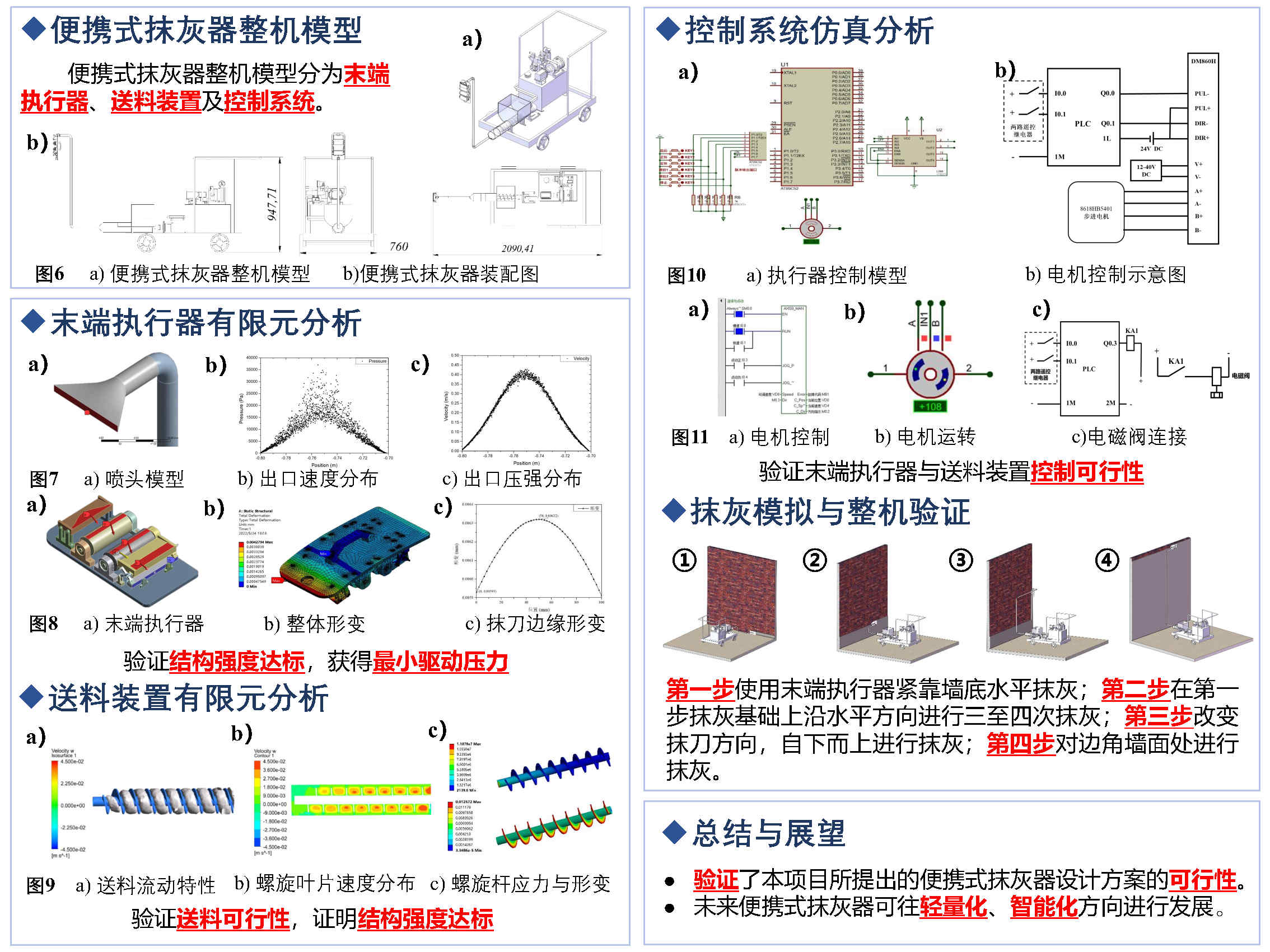 對(duì)便攜式抹灰器的研究現(xiàn)狀進(jìn)行調(diào)研,完成質(zhì)量需求分析。完成末端執(zhí)行器的零件設(shè)計(jì),可制造性及可裝配性分析;完成送料裝置的原理設(shè)計(jì),零件選型及裝配設(shè)計(jì);完成抹灰器控制系統(tǒng)硬件選型,程序設(shè)計(jì)及送料控制箱設(shè)計(jì)。對(duì)末端執(zhí)行器進(jìn)行抹刀控制仿真,完成送料控制系統(tǒng)模擬驗(yàn)證,驗(yàn)證控制程序和接線方式的合理性;對(duì)末端執(zhí)行器進(jìn)行送料管混凝土流動(dòng)仿真、前抹刀形變仿真及末端執(zhí)行器整機(jī)形變仿真,完成最大形變校核;對(duì)送料裝置進(jìn)行流體仿真、流固耦合仿真,驗(yàn)證送料功能及校核強(qiáng)度。最后完成便攜式抹灰器抹灰流程模擬,驗(yàn)證整體設(shè)計(jì)方案可行性。