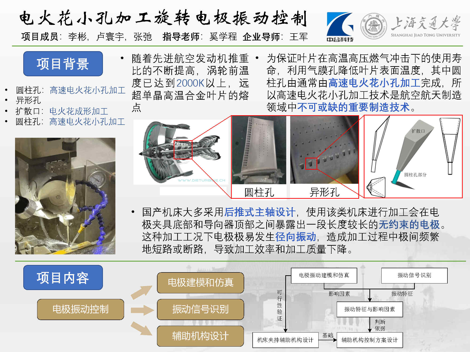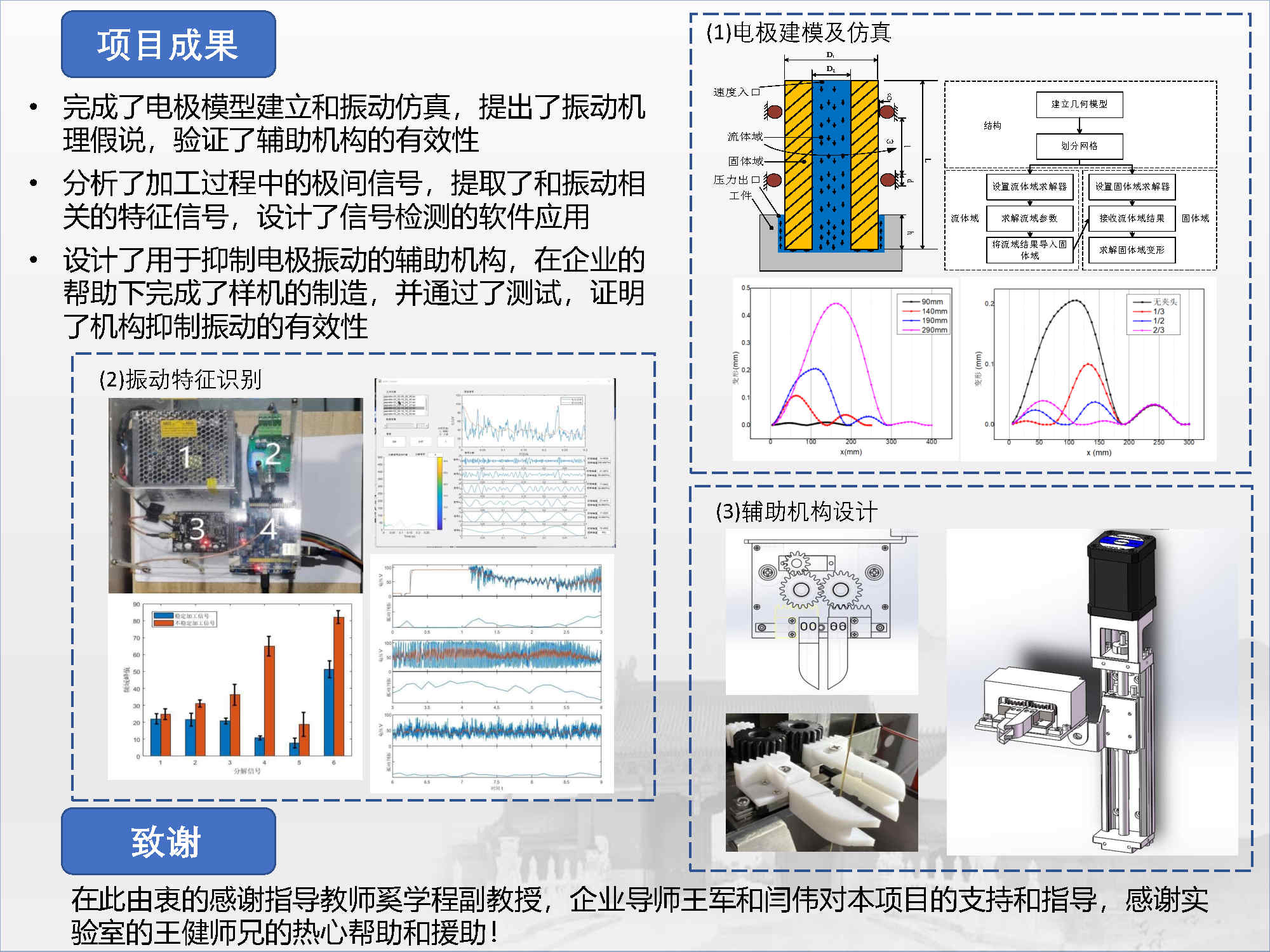 總體目標(biāo)是設(shè)計(jì)一款適用于中谷集團(tuán)現(xiàn)有的后推式主軸機(jī)床的電極輔助夾持裝置,具體包括:建立數(shù)學(xué)模型以及電極有限元模型,探究電極絲振動(dòng)成因,分析電極絲振動(dòng)的影響因素;搭建信號(hào)采集系統(tǒng),對(duì)電火花加工過程中振動(dòng)信號(hào)進(jìn)行分析與識(shí)別,尋找電極發(fā)生振動(dòng)時(shí)的特征信號(hào);基于仿真結(jié)果以及客戶需求完成夾持機(jī)構(gòu)、升降機(jī)構(gòu)的詳細(xì)設(shè)計(jì),繪制工程圖圖紙,最后進(jìn)行樣機(jī)的加工裝配,驗(yàn)證抑制振動(dòng)的有效性。
