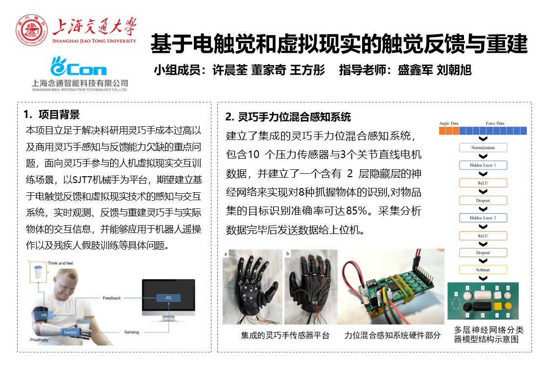 本項目立足于解決科研用靈巧手成本過高以及商用靈巧手感知與反饋能力欠缺的重點問題,擴(kuò)展商用靈巧手的感知和反饋功能,促進(jìn)推動靈巧手感知領(lǐng)域的keyan成果向民用轉(zhuǎn)化。本項目面向靈巧手參與的人機(jī)虛擬現(xiàn)實交互訓(xùn)練場景,以SJT7機(jī)械手為平臺基礎(chǔ),期望建立基于電觸覺反饋和虛擬現(xiàn)實技術(shù)的感知與交互系統(tǒng)以實現(xiàn)觸覺信息的反饋通路,實時觀測、反饋與重建靈巧手與實際物體的交互信息,并能夠應(yīng)用于機(jī)器人遙操作以及殘疾人假肢訓(xùn)練等具體問題。