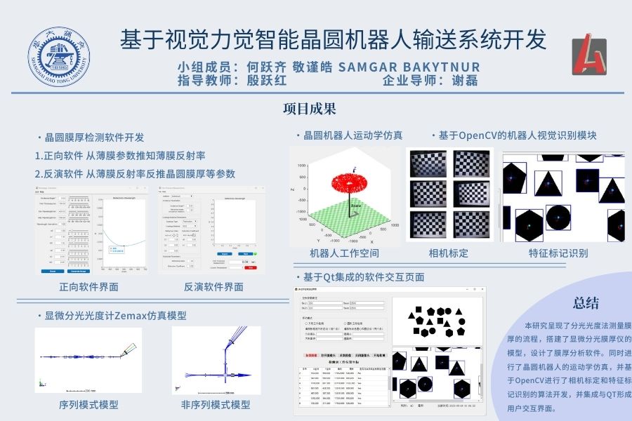 晶圓?產(chǎn)?藝中常常使?的膜包括?氧化硅等鈍化膜、光刻?形成的膜等。基于分光光度法確認(rèn)這些膜的厚度從?精確控制后續(xù)加??藝的起點(diǎn)與終點(diǎn)。主要包括:設(shè)計(jì)顯微分光光度計(jì)的仿真模型、設(shè)計(jì)膜厚檢測軟件等。同時(shí),通過對(duì)機(jī)械臂與晶圓狀態(tài)進(jìn)行視覺識(shí)別,實(shí)現(xiàn)對(duì)機(jī)械手與晶圓片在各個(gè)工位轉(zhuǎn)換時(shí)的狀態(tài)監(jiān)測,主要包括晶圓是否抓取、角度是否符合預(yù)期值、機(jī)械臂的運(yùn)動(dòng)狀態(tài)等。