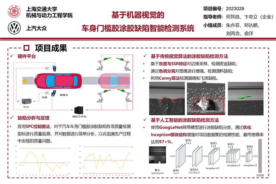 成功構(gòu)建一套智能化的門檻膠質(zhì)量缺陷檢測(cè)系統(tǒng):采用傳統(tǒng)視覺算法缺陷檢測(cè),成功對(duì)區(qū)域性缺陷(包括漏噴、飛揚(yáng)、刮蹭等),波浪、滴料等缺陷類型進(jìn)行檢測(cè)。基于深度學(xué)習(xí)神經(jīng)網(wǎng)絡(luò)對(duì)涂膠缺陷進(jìn)行分類,實(shí)現(xiàn)對(duì)涂膠缺陷數(shù)據(jù)集的有效檢測(cè),準(zhǔn)確率達(dá)到97+%。應(yīng)用SPC控制圖法,對(duì)車身門檻涂膠缺陷各項(xiàng)質(zhì)量檢測(cè)指標(biāo)進(jìn)行檢測(cè),用于追溯生產(chǎn)過程中出現(xiàn)的質(zhì)量問題。并針對(duì)此智能檢測(cè)系統(tǒng)設(shè)計(jì)對(duì)應(yīng)的程序界面,使各處理環(huán)節(jié)可視化。