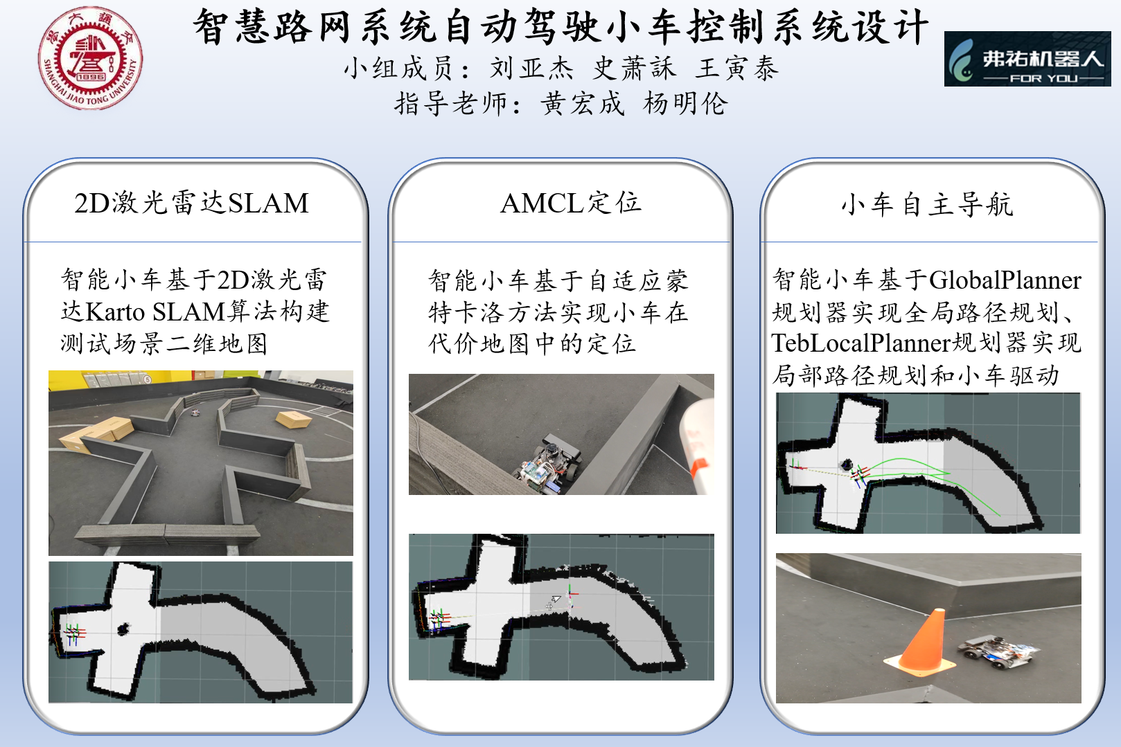 最終小車能夠完成以下任務(wù):一,通過視覺識(shí)別獲取道路車道線的位置和走向,不斷調(diào)整前進(jìn)方向,小車能夠在車道線內(nèi)行駛;二,通過計(jì)算機(jī)視覺中的物體識(shí)別算法實(shí)現(xiàn)道路中交通信號(hào)的識(shí)別,并根據(jù)識(shí)別到的信號(hào)調(diào)整小車速度,例如識(shí)別到紅燈停下來,識(shí)別到ETC通道加速通過;三,通過激光雷達(dá)SLAM技術(shù)實(shí)現(xiàn)跑道周圍環(huán)境的建圖,顯示小車當(dāng)前位置,并能夠完成不同位置之間的路徑規(guī)劃,同時(shí)檢測(cè)道路中的障礙物,當(dāng)識(shí)別到障礙物時(shí)使小車停止運(yùn)動(dòng)。