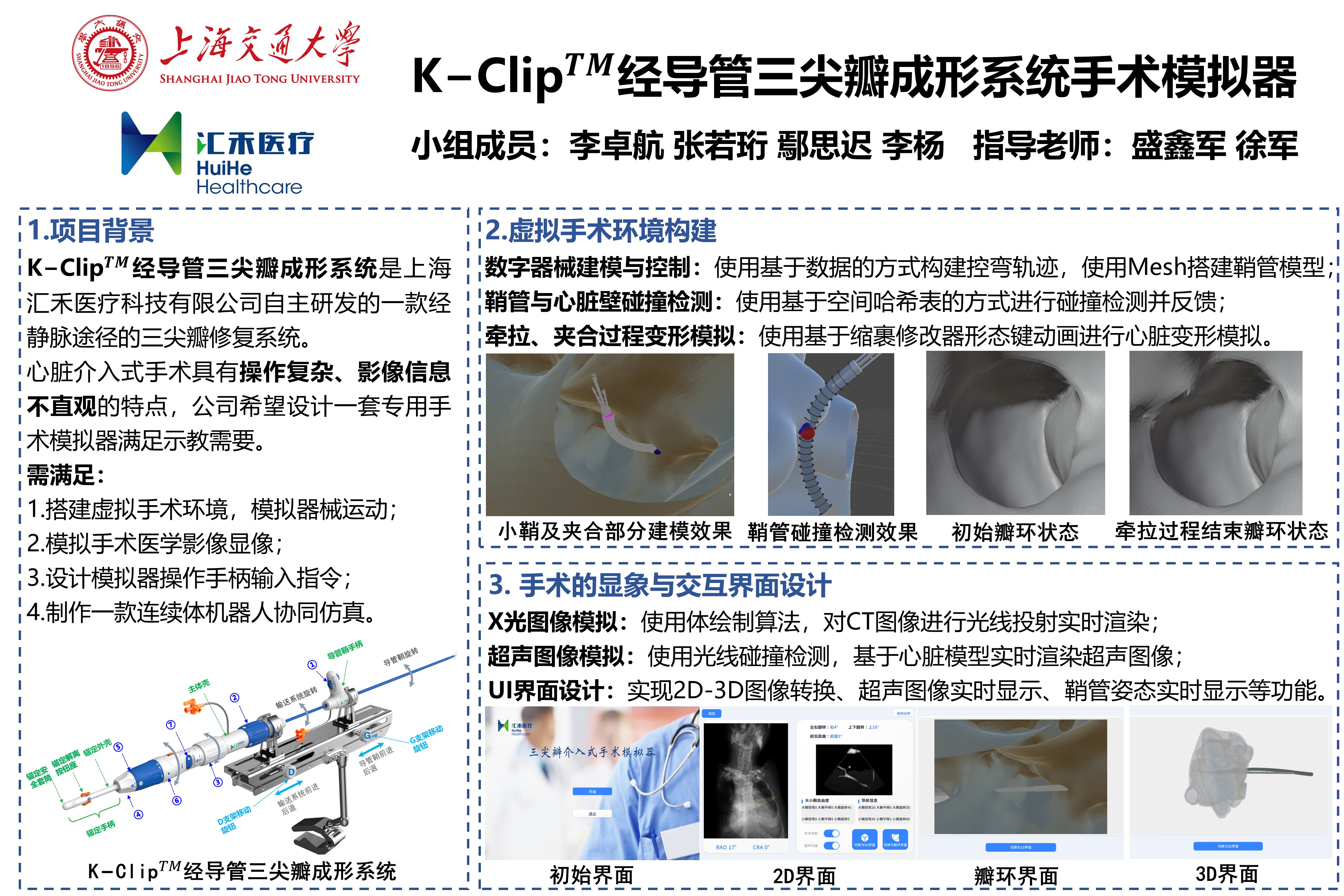 心臟介入手術(shù)過(guò)程復(fù)雜,操作難度高,手術(shù)狀況獲取需查看醫(yī)學(xué)影像,醫(yī)生會(huì)受到輻射影響。為了降低醫(yī)療器械操作培訓(xùn)成本與風(fēng)險(xiǎn),本項(xiàng)目基于匯禾醫(yī)療K-Clip?器械設(shè)計(jì)了一套專用的手術(shù)模擬系統(tǒng),以滿足心臟瓣膜手術(shù)的示教與培訓(xùn)需求。