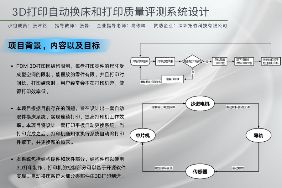 本項目根據(jù)目前存在的問題,旨在設(shè)計出一套面向FDM 3D打印機的智能缺陷檢測和打印平板自動更換系統(tǒng),提高打印機工作效率同時,該設(shè)備利用打印面板自動更換系統(tǒng)實現(xiàn)了遠程操控與自動作業(yè)。本系統(tǒng)包括結(jié)構(gòu)硬件和軟件部分,結(jié)構(gòu)件可以使用3D打印制作,打印機的控制部分可以基于開源軟件實現(xiàn)。自動換床系統(tǒng)大部分零部件由3D打印制造。項目為實現(xiàn)FDM 3D打印打印面板自動更換功能,具體流程如下:當(dāng)打印完成之后,打印機執(zhí)行自動更換打印平板操作,導(dǎo)軌將打印面板取出,將打印件取下,把執(zhí)行過打印任務(wù)的打印平板收納起來,并更換新的熱床,進行下一打印任務(wù)。