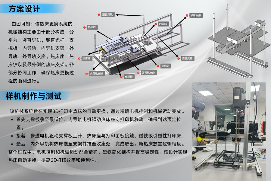 然后,外導(dǎo)軌電機驅(qū)動熱床鏟插入空隙,使熱床與面板完全分離。內(nèi)外導(dǎo)軌電機同時工作,驅(qū)動導(dǎo)軌移動,熱床在磁鐵吸引和熱床鏟支撐下離開打印機。