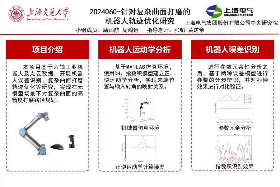 復(fù)雜曲面零部件被廣泛應(yīng)用在汽車、航空航天、船舶等諸多領(lǐng)域中,這類零件通常對表面質(zhì)量要求較高,表面存在的毛刺、焊縫殘高、粗糙度不達(dá)標(biāo)等問題,極易影響零件的空氣動力學(xué)性能和服役表現(xiàn),通常需要高精度打磨來保證其表面質(zhì)量。然而其中存在機(jī)器人自身精度不足、點(diǎn)云數(shù)據(jù)處理復(fù)雜、打磨軌跡生成困難等一系列難題。對此,本項目基于六軸工業(yè)機(jī)器人及點(diǎn)云數(shù)據(jù),開展機(jī)器人誤差識別、復(fù)雜曲面打磨軌跡優(yōu)化等研究,實現(xiàn)在無模型場景下對復(fù)雜曲面的高精度打磨路徑規(guī)劃。