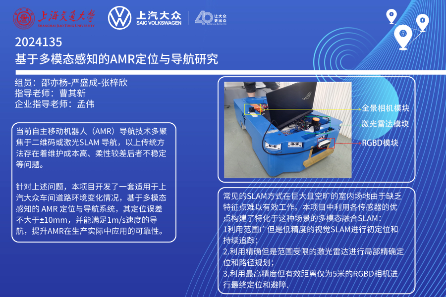 項(xiàng)目擬開發(fā)一套適用于上汽大眾車間道路環(huán)境變化情況,基于多模態(tài)感知的自主導(dǎo)航移動(dòng)機(jī)器人(AMR)定位與導(dǎo)航系統(tǒng)。要求其定位誤差不大于±10mm,并能滿足1m/s速度的導(dǎo)航,滿足上汽大眾工業(yè)生產(chǎn)的需要,并提升AMR在生產(chǎn)實(shí)際中應(yīng)用的可靠性。