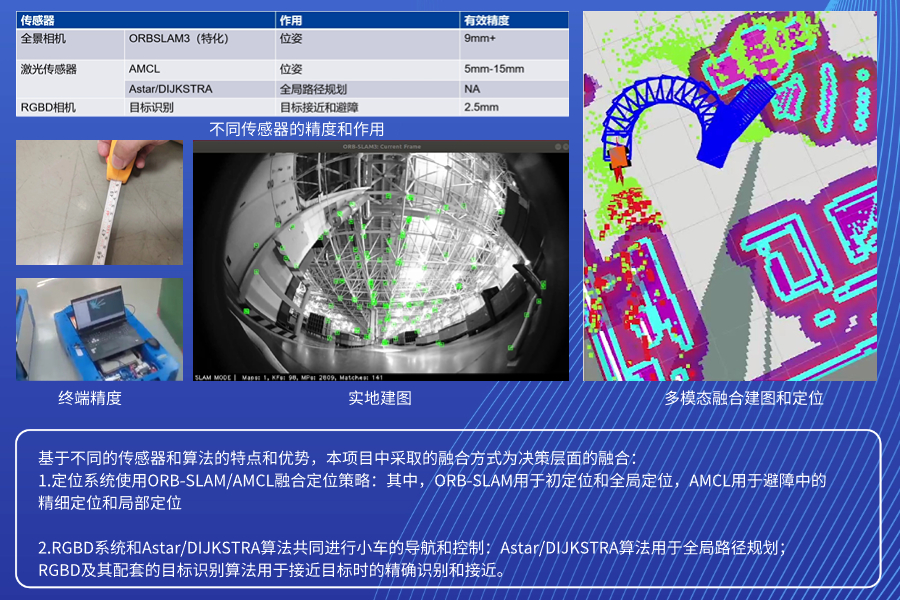 AMR采用多傳感器融合的方式來(lái)實(shí)現(xiàn)良好的定位,導(dǎo)航,SLAM建圖與避障工作,采用全景相機(jī)、RGBD相機(jī)、激光雷達(dá)三種傳感器,其中:RGBD感知節(jié)點(diǎn)負(fù)責(zé)感知周圍的移動(dòng)障礙以及車道線等標(biāo)識(shí)物,用于避障和精確定位操作;全景相機(jī)SLAM節(jié)點(diǎn)負(fù)責(zé)導(dǎo)航地圖的構(gòu)建,初定位以及機(jī)器人位姿跟蹤;激光SLAM節(jié)點(diǎn)負(fù)責(zé)感知近距離的障礙,對(duì)AMR的緊急避障和方向修正進(jìn)行決策。