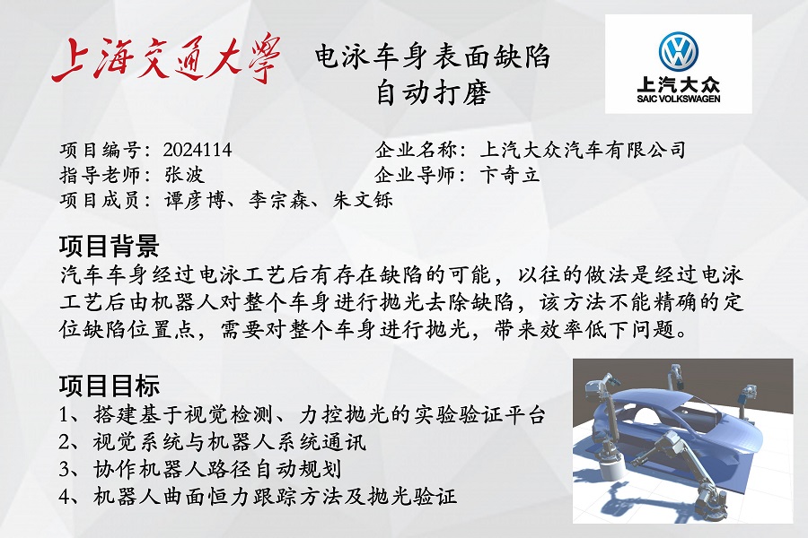 汽車車身經(jīng)過電泳工藝后有存在缺陷的可能,以往的做法是經(jīng)過電泳工藝后由機(jī)器人對整個車身進(jìn)行拋光去除缺陷,該方法不能精確的定位缺陷位置點,需要對整個車身進(jìn)行拋光,帶來效率低下問題。為了提高電泳車身的質(zhì)量控制水平,傳統(tǒng)的人工檢測打磨方法已經(jīng)不能滿足高效、準(zhǔn)確的需求。本項目提出視覺精確定位缺陷位置-機(jī)器人自主規(guī)劃拋光軌跡-機(jī)器人力控拋光的方式,提升機(jī)器人拋光效率。根據(jù)企業(yè)需求與技術(shù)分析,將項目分解為三個子項目,分別聚焦視覺缺陷檢測定位、協(xié)作機(jī)器人路徑自動規(guī)劃、協(xié)作機(jī)器人缺陷自動打磨。