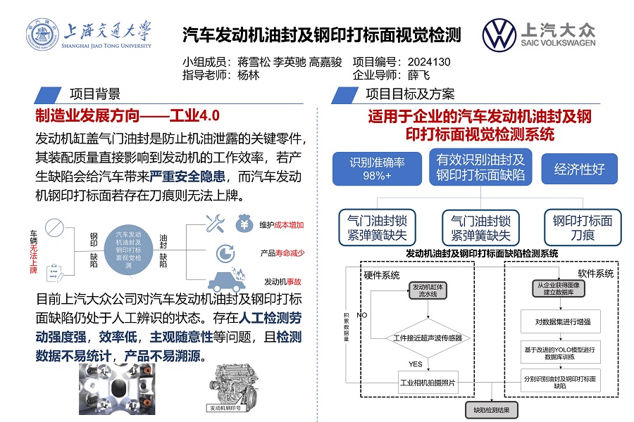 發(fā)動(dòng)機(jī)是汽車的關(guān)鍵動(dòng)力總成,發(fā)動(dòng)機(jī)的產(chǎn)品質(zhì)量是整車品質(zhì)的重要組成部分。其中,車輛在車輛管理所上牌時(shí)會(huì)在鋼印打標(biāo)面進(jìn)行標(biāo)記,若鋼印打標(biāo)不清晰無法上牌。而若在發(fā)動(dòng)機(jī)生產(chǎn)線上存在油封裝配不合格問題,會(huì)導(dǎo)致發(fā)動(dòng)機(jī)機(jī)油泄漏等質(zhì)量事故,增加車輛維護(hù)成本。目前企業(yè)流水線上,對于上述產(chǎn)品質(zhì)量檢測仍采取效率低易出錯(cuò)的人工目測方法。因此,本項(xiàng)目旨在實(shí)現(xiàn)一套自動(dòng)化、智能化的汽車發(fā)動(dòng)機(jī)油封和鋼印打標(biāo)面的視覺在線檢測系統(tǒng)。