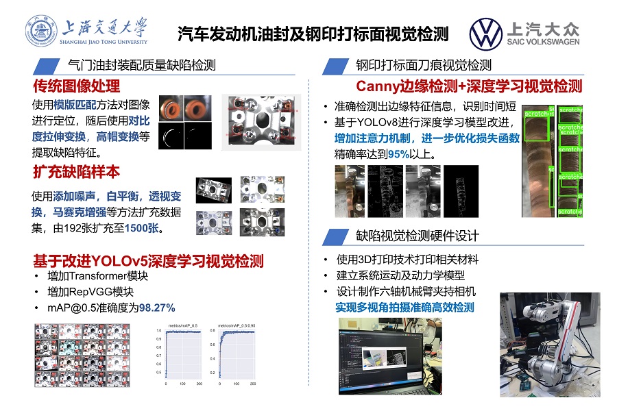 本項(xiàng)目圍繞油封檢測,鋼印打標(biāo)面刀痕檢測,分別開展了基于數(shù)字圖像處理、深度學(xué)習(xí)的視覺檢測研究,收集制作了不同缺陷的樣本,并通過數(shù)據(jù)增強(qiáng)方法對數(shù)據(jù)進(jìn)行增強(qiáng)處理,隨后基于YOLO深度學(xué)習(xí)框架改進(jìn)相關(guān)算法對油封及刀痕的缺陷進(jìn)行檢測,提出油封裝配質(zhì)量的評價(jià)準(zhǔn)則及鋼印打標(biāo)面視覺檢測的合格性判定。同時(shí)設(shè)計(jì)完成了六軸機(jī)械臂來實(shí)現(xiàn)對檢測設(shè)備的夾持與固定,可進(jìn)行產(chǎn)線的檢測,油封檢測準(zhǔn)確率到達(dá)98.2%,可一定程度上替代人工檢測。