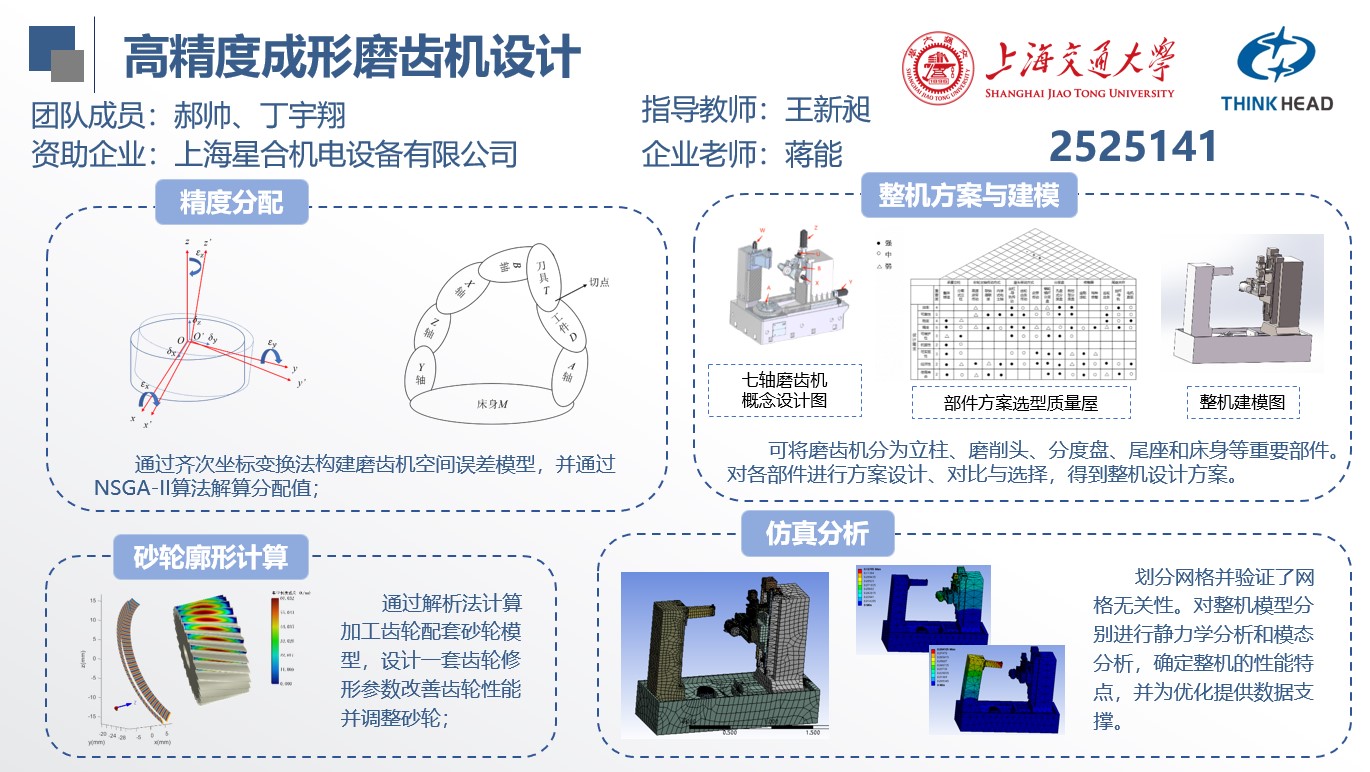 主要目標(biāo)分為兩部分,由郝帥和丁宇翔兩名同學(xué)完成。郝帥同學(xué)的目標(biāo)為完成高精度成形磨齒機(jī)的空間誤差模型構(gòu)建,并以此為基礎(chǔ)設(shè)計(jì)精度分配算法完成對(duì)機(jī)床的精度分配;研究磨削齒輪盤形刀具輪廓設(shè)計(jì)方法,根據(jù)一典型型號(hào)齒輪加工設(shè)計(jì)一配套砂輪并完成廓形計(jì)算,并根據(jù)齒輪修形需求對(duì)其進(jìn)行調(diào)整。丁宇翔同學(xué)的目標(biāo)為完成高精度成形磨齒機(jī)大型結(jié)構(gòu)件的結(jié)構(gòu)和強(qiáng)度設(shè)計(jì)以及驅(qū)動(dòng)及精密傳動(dòng)部件的選型和結(jié)構(gòu)設(shè)計(jì);基于結(jié)構(gòu)件選型設(shè)計(jì),完成高精度成型磨齒機(jī)的整機(jī)裝配設(shè)計(jì)。