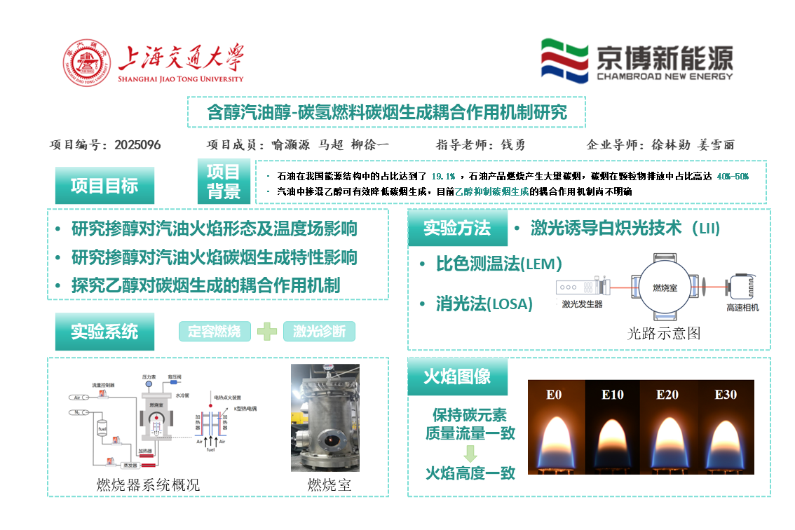化石燃料在如今乃至未來很長一段時(shí)間內(nèi)仍將占據(jù)全球能源結(jié)構(gòu)的主導(dǎo)地位,而對其過度依賴正在加劇氣候變化與空氣污染,能源危機(jī)迫在眉睫。乙醇燃料因其可再生、低排放等優(yōu)勢被廣泛應(yīng)用于化石燃料摻混中,用于改善燃燒質(zhì)量和減少污染物排放。但目前摻混乙醇對汽油火焰特性及碳煙生成特性的影響機(jī)制尚不明確,因此本項(xiàng)目通過實(shí)驗(yàn)探究了不同壓力下不同乙醇摻混比例的乙醇-92汽油混合燃料的燃燒特性,同時(shí)通過數(shù)值模擬方法探究了乙醇對碳煙生成的作用機(jī)理。