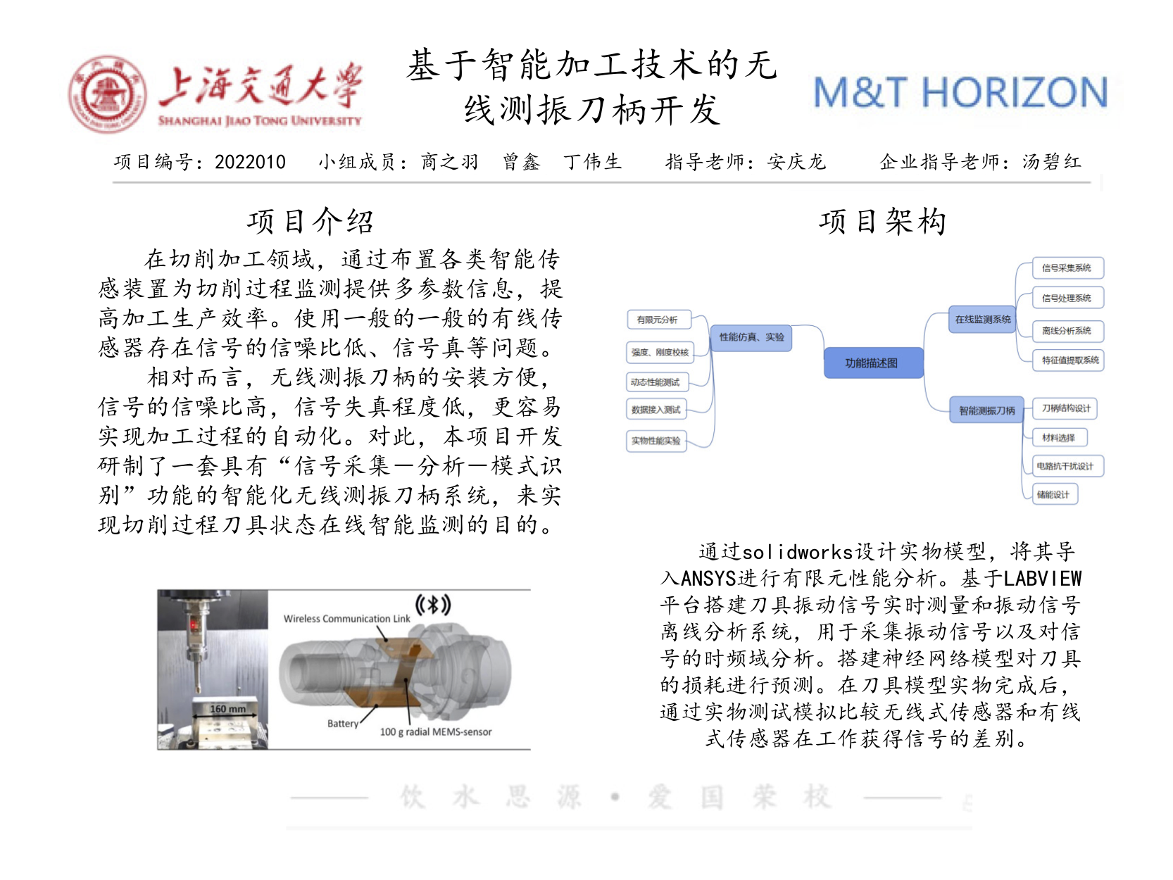 在切削加工領域,通過布置各類智能傳感裝置為切削過程監(jiān)測提供多參數(shù)信息,通過大數(shù)據(jù)分析智能識別刀具的加工狀態(tài),實時反饋刀具信息,提高加工生產(chǎn)效率。因為有線傳感器和數(shù)據(jù)采集設備之間需要接線,這導致傳感器無法安裝在旋轉主軸等移動裝置上。而如果將傳感器置于信號發(fā)生位置周圍,則會造成原始信號的信噪比低、信號失真等問題。相對而言,無線測振刀柄的安裝方便,信號的信噪比高,信號失真程度低,使用無線測振刀柄作為信號采集裝置更容易實現(xiàn)加工過程的自動化。對此,本項目開發(fā)研制了一套具有“振動信號采集-分析-模式識別”功能的智能化無線測振刀柄系統(tǒng),來實現(xiàn)切削過程刀具狀態(tài)在線智能監(jiān)測的目的。