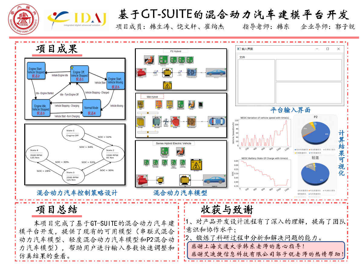 混合動(dòng)力汽車是當(dāng)前熱門的研究課題,而用于混合動(dòng)力汽車整車級(jí)建模的GT-SUITE軟件操作較復(fù)雜,學(xué)習(xí)和使用的時(shí)間成本較高。為了在汽車仿真工作中簡(jiǎn)化人工操作流程,加快開發(fā)速度,本項(xiàng)目基于GT-SUITE模型,應(yīng)用Python腳本和工具,開發(fā)了一款混合動(dòng)力汽車建模平臺(tái),可以在一個(gè)簡(jiǎn)潔的界面內(nèi)對(duì)串聯(lián)式混合動(dòng)力汽車、輕度混合動(dòng)力汽車、P2架構(gòu)混合動(dòng)力汽車模型進(jìn)行各模塊參數(shù)賦值、計(jì)算并可視化顯示仿真計(jì)算結(jié)果,實(shí)現(xiàn)了上述三類混合動(dòng)力汽車模型的自動(dòng)搭建和快速分析。