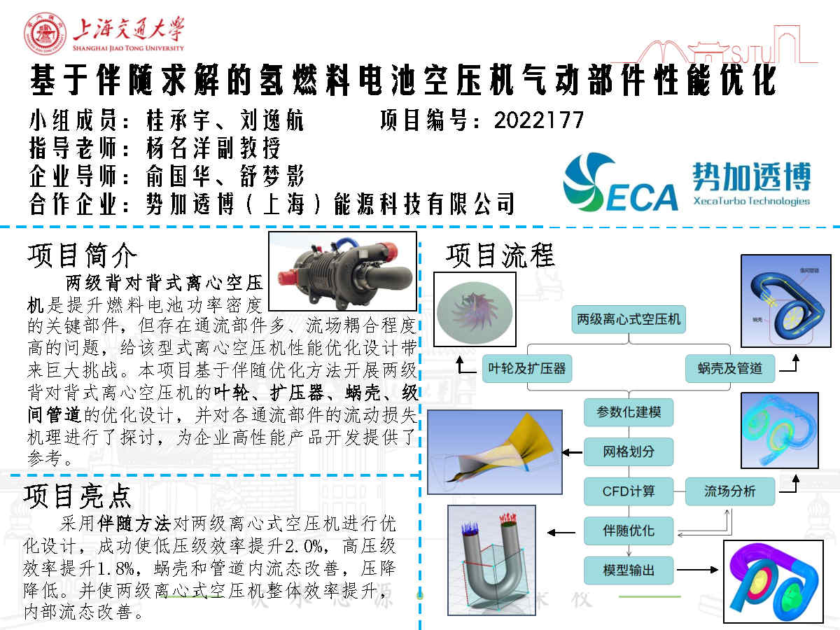空壓機(jī)是氫燃料電池系統(tǒng)的關(guān)鍵部件,而電機(jī)直驅(qū)離心式壓氣機(jī)憑借其高效率等特點(diǎn)成為燃料電池系統(tǒng)的首選。為了克服軸向力和電機(jī)轉(zhuǎn)速限制問題,兩級背對背式離心壓縮機(jī)成為廣泛應(yīng)用的一種布局形式。然而該型離心壓縮機(jī)存在兩個串聯(lián)的離心葉輪和蝸殼,以及較長的級間管道,部件之間性能相互影響,因而對設(shè)計提出了新的挑戰(zhàn)。本項(xiàng)目基于伴隨優(yōu)化方法針對氫燃料電池一型背對背式兩級離心式空壓機(jī)的葉輪、擴(kuò)壓器、蝸殼和級間管道等氣動部件開展優(yōu)化設(shè)計。