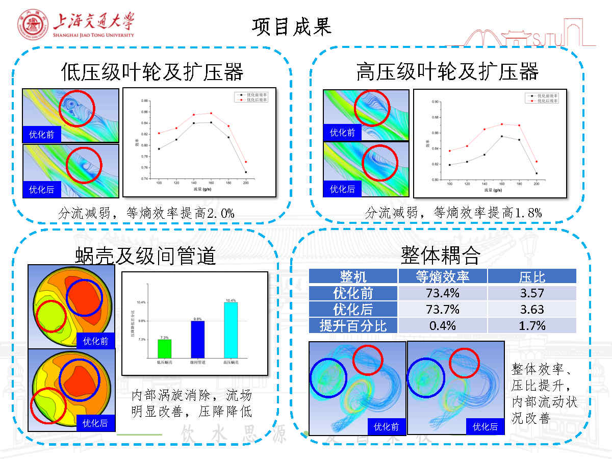 4、 進(jìn)行了整體耦合計算,優(yōu)化后效率提升了0.4%,壓比提升了1.7%,內(nèi)部流態(tài)明顯改善。