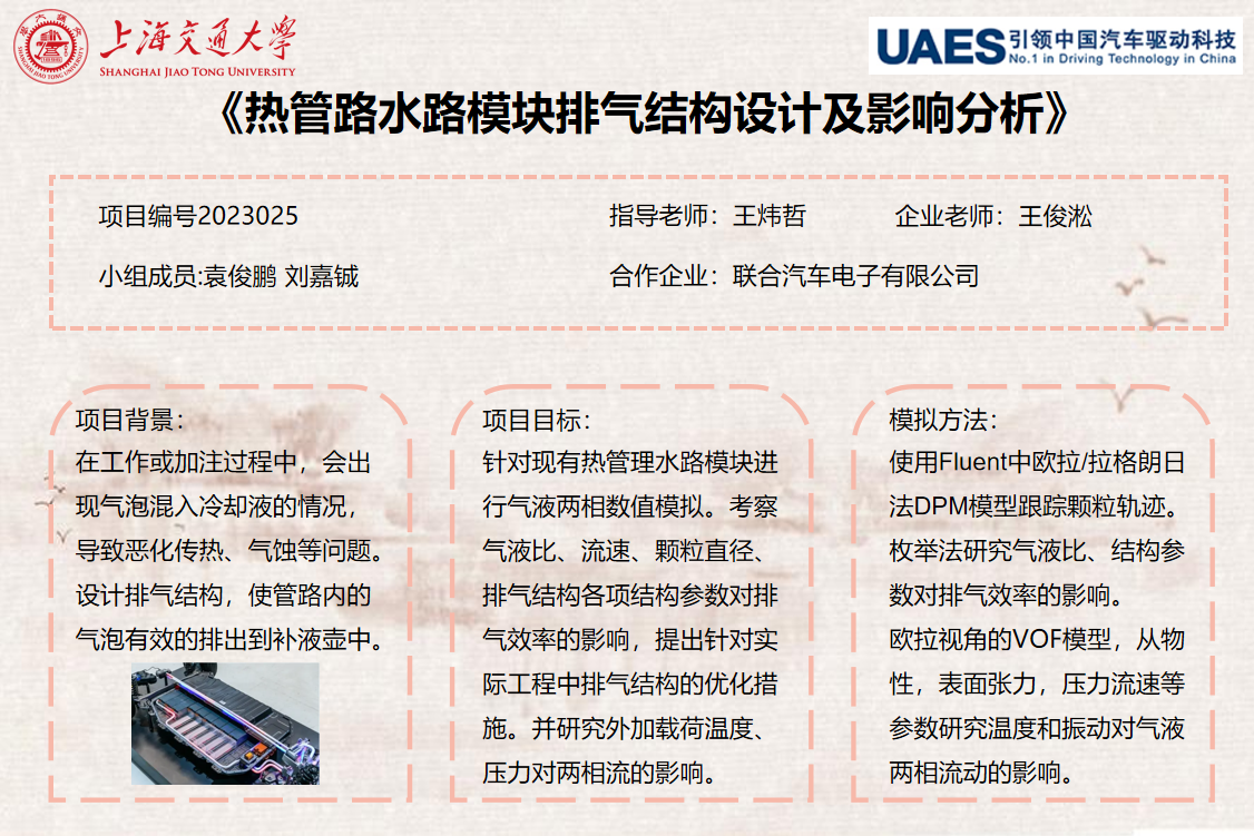 集成化是熱管理重要發(fā)展的趨勢(shì)。水路集成模塊通過(guò)傳遞冷卻液對(duì)電池,電機(jī)和乘客艙等部件進(jìn)行換熱,排氣性能是其關(guān)鍵性能之一,在工作過(guò)程中會(huì)出現(xiàn)氣泡融入或混入冷卻液的情況,使冷卻液換熱效率降低,出現(xiàn)流阻增大等問(wèn)題。因此為了能規(guī)避氣泡對(duì)水路模塊的影響,優(yōu)化現(xiàn)有排氣結(jié)構(gòu),能夠引導(dǎo)氣體進(jìn)入到上端的含液容器結(jié)構(gòu),讓盡量少的氣體進(jìn)入壓縮機(jī)或在下個(gè)循環(huán)進(jìn)入到水路模塊中。此外,當(dāng)溫度升高、地面振動(dòng)傳遞到管路,這些因素的影響,可能會(huì)造成氣泡在正常隨流過(guò)程中發(fā)生改變,需要研究外載對(duì)管內(nèi)氣液兩相流動(dòng)的影響。