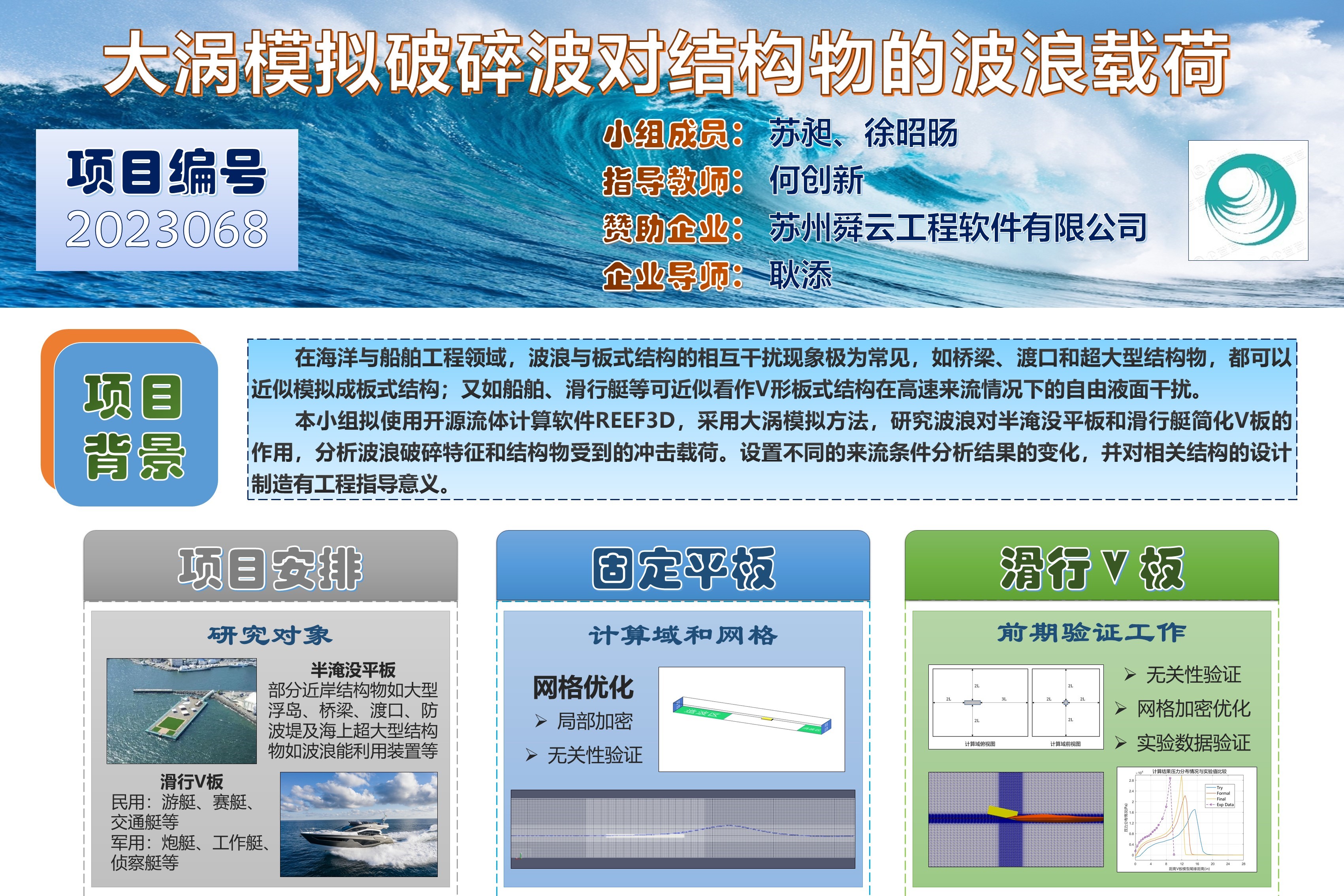 在船舶與海洋工程領(lǐng)域,常見波浪與板式結(jié)構(gòu)相互作用的現(xiàn)象。本項目使用開源流體計算軟件REEF3D,采用大渦模擬方法,選取兩種較為常見的研究對象進行CFD分析:半淹沒平板用于模擬靜態(tài)的大型結(jié)構(gòu)物、滑行V板用于模擬航行中的船艇。首先選用相關(guān)的實驗文獻對計算設(shè)置準(zhǔn)確性與結(jié)果可靠性進行驗證,然后對工況參數(shù)進行調(diào)整,分析多種來流情況、結(jié)構(gòu)物形態(tài)下板式結(jié)構(gòu)浸水壁面的壓力載荷分布情況、力與力矩載荷分布情況,以及自由液面受到結(jié)構(gòu)物干擾后發(fā)展情況。