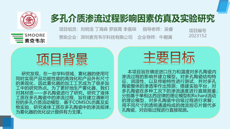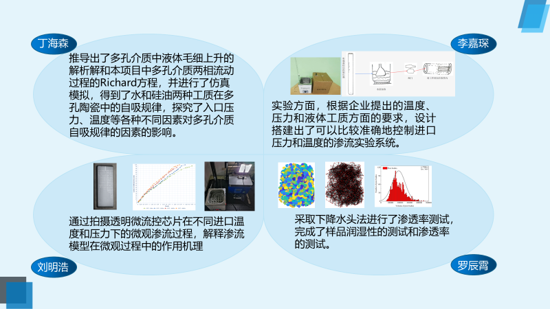 羅辰霄同學對多孔陶瓷結構特征、潤濕性、以及傳輸特性進行測試,并對多孔陶瓷整體的滲透率作出預測;李嘉琛同學搭建實驗平臺,對多孔陶瓷在多種工況下的滲流速度進行直接測量;丁海森同學分別基于單相達西定律的理論模型和Richard流動的理論模型,對多孔陶瓷中自吸過程進行求解;劉明浩同學用不同尺寸的透明通道構成的微流控芯片替代多孔陶瓷,對自吸過程進行直接觀測。