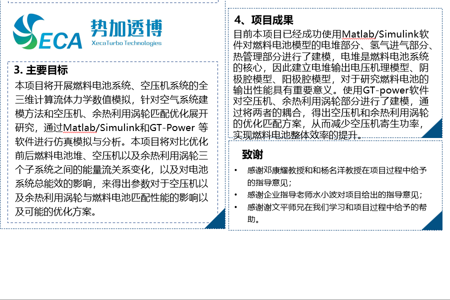 本項(xiàng)目將開展燃料電池系統(tǒng)、空壓機(jī)系統(tǒng)的全三維計(jì)算流體力學(xué)數(shù)值模擬,針對(duì)空氣系統(tǒng)建模方法和空壓機(jī)、余熱利用渦輪匹配優(yōu)化展開研究,通過Matlab/Simulink和GT-Power 等軟件進(jìn)行仿真模擬與分析。本項(xiàng)目將對(duì)比優(yōu)化前后燃料電池堆、空壓機(jī)以及余熱利用渦輪三個(gè)子系統(tǒng)之間的能量流關(guān)系變化,以及對(duì)電池系統(tǒng)總能效的影響,來得出參數(shù)對(duì)于空壓機(jī)以及余熱利用渦輪與燃料電池匹配性能的影響以及可能的優(yōu)化方案。