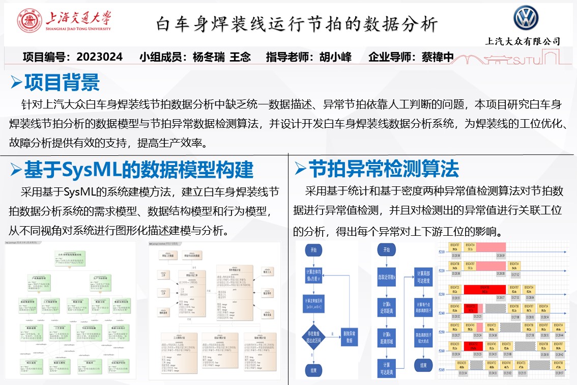 本項目通過對SysML建模方法與異常數(shù)據(jù)檢測算法的研究,設計開發(fā)白車身焊裝線數(shù)據(jù)系統(tǒng),實現(xiàn)對生產(chǎn)節(jié)拍信息的合理分析,從而支持生產(chǎn)線運行過程的管理決策。