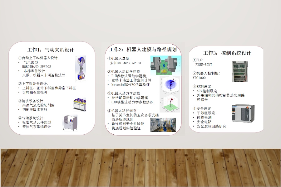 氣動(dòng)夾爪方面,完成了氣爪設(shè)計(jì)和實(shí)物裝配,并且能夠按照預(yù)期運(yùn)行,符合項(xiàng)目需求。此外,完成機(jī)器人自動(dòng)上下料機(jī)器人系統(tǒng)的其他設(shè)備的設(shè)計(jì)于安裝,包含:上下料盤設(shè)備、清洗設(shè)備和其他防護(hù)設(shè)備。機(jī)器人建模與路徑規(guī)劃方面,完成了如下內(nèi)容:(1)自動(dòng)上下料關(guān)節(jié)機(jī)器人的選型,選用了安川MOTOMAN GP-25六軸機(jī)械臂,(2)完成了基于D-H參數(shù)法的運(yùn)動(dòng)學(xué)建模機(jī)器人,進(jìn)行了基于蒙特卡洛法的工作空間計(jì)算,(3)在CAD模型法動(dòng)力學(xué)參數(shù)辨識(shí)上,基于拉格朗日法完成了動(dòng)力學(xué)建模,(4)實(shí)現(xiàn)基于關(guān)節(jié)空間的五次多項(xiàng)式插值法軌跡規(guī)劃,并進(jìn)行了路徑規(guī)劃安全性驗(yàn)證和實(shí)際運(yùn)行測(cè)試。在控制系統(tǒng)設(shè)計(jì)方面完成了如下內(nèi)容:(1)PLC選型,采用FX5U-80MT,(2)機(jī)器人控制柜選型,采用YRC1000,(3)控制設(shè)定,采用ARM控制設(shè)定,并且探討外用軸和其他控制算法實(shí)現(xiàn)路徑,(4)符合車間安全規(guī)范的設(shè)定,如:干涉區(qū)設(shè)定、碰撞檢測(cè)、安全電路和安全邏輯回路研究。
