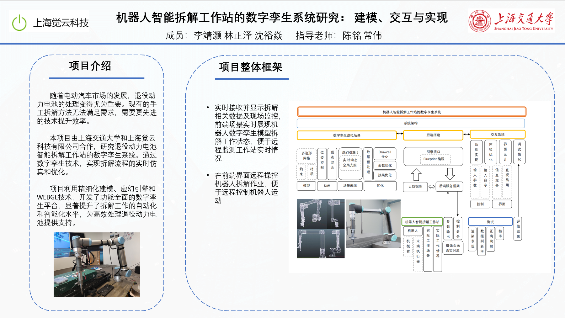 本項(xiàng)目名稱為《退役動力電池機(jī)器人智能拆解工作站的數(shù)字孿生系統(tǒng)研究》,合作單位為上海交通大學(xué)和上海覺云科技有限公司。隨著電動汽車市場的快速發(fā)展,妥善處理退役動力電池對生態(tài)環(huán)境保護(hù)和資源利用具有重要意義。項(xiàng)目通過數(shù)字孿生技術(shù),在虛幻引擎(UE)和WEB前端中實(shí)現(xiàn)機(jī)器人拆解作業(yè)的實(shí)時(shí)仿真還原、實(shí)時(shí)顯示拆解信息以及遠(yuǎn)程控制機(jī)器人,顯著提升了拆解過程的效率和穩(wěn)定性,支持新能源汽車產(chǎn)業(yè)的可持續(xù)發(fā)展。